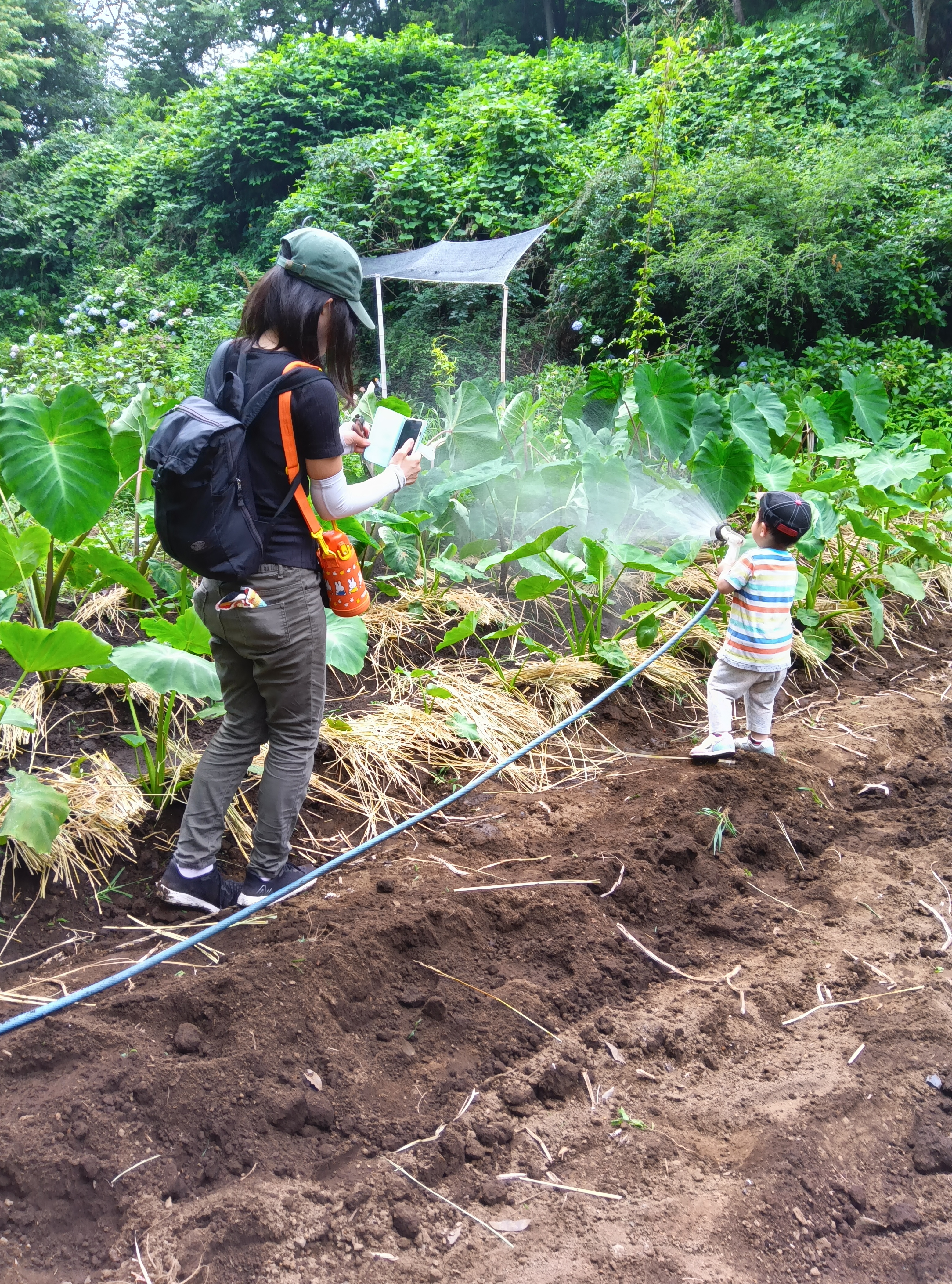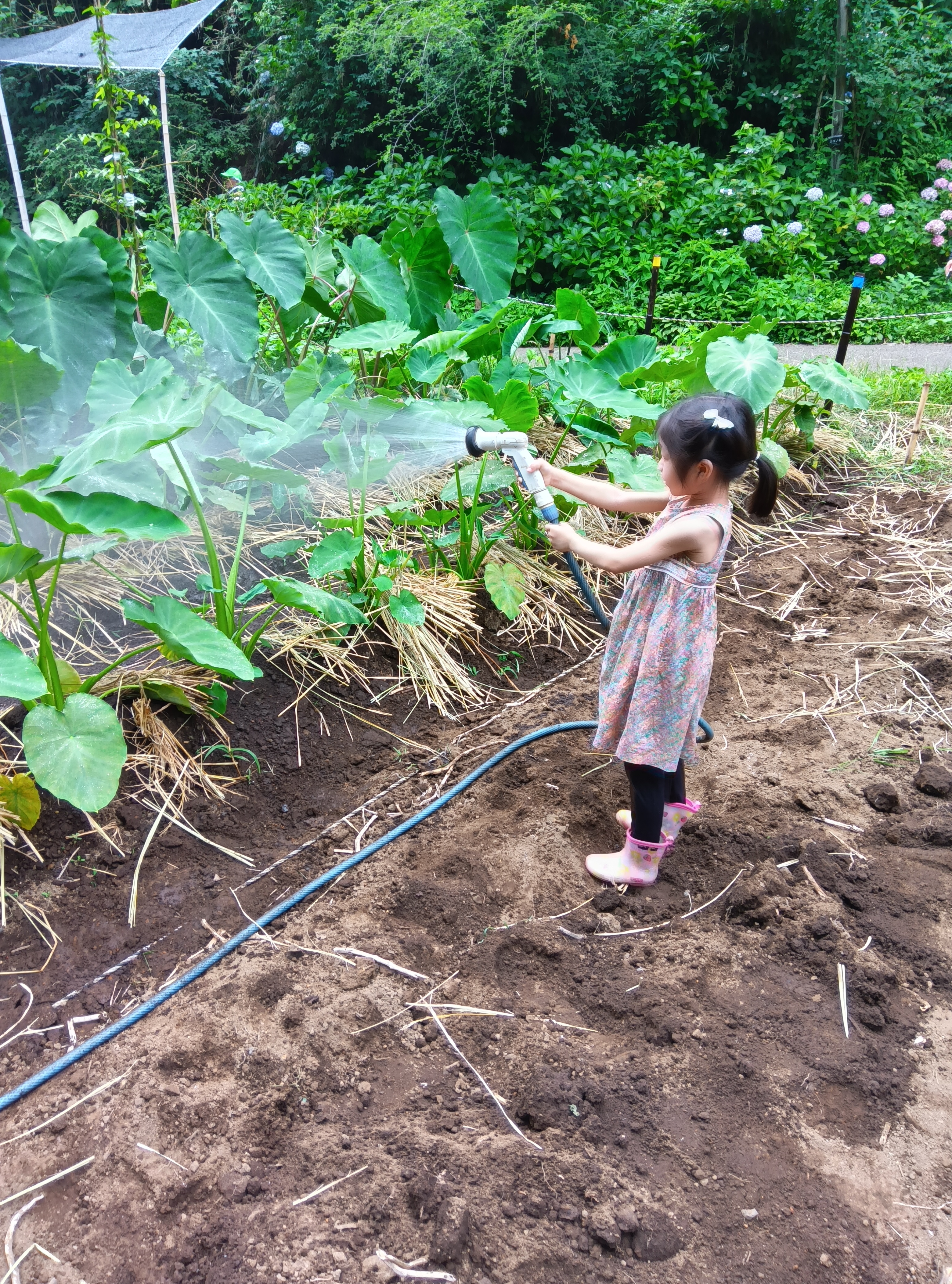 先週の雨で急激に成長した葉・茎を傷めないように気を付けながら根本付近に追肥をして鍬で土寄せをします。サトイモは乾燥を嫌うので昨年の稲刈りの残りの藁を半分に切って敷いていきます。