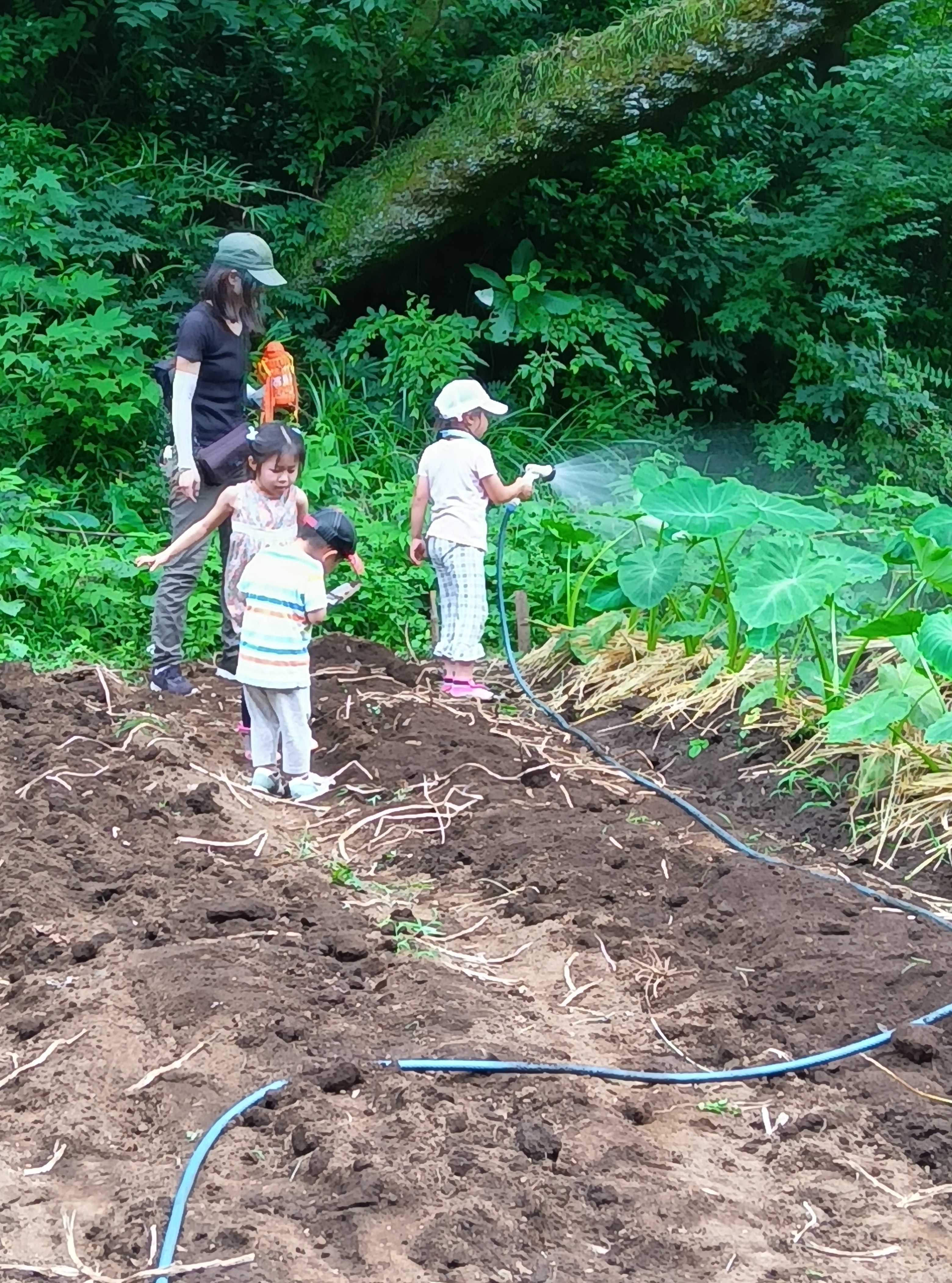 その後は午前中に収穫したジャガイモ畑にマリーゴールドの苗を移植する作業です。これは土壌線虫の被害を軽減するためのものでいわゆるコンパニオンプラントと呼ばれるものです。 最後に畑の隅々までホースで水をたっぷりかけていきますが、水しぶきをを浴びながら気持ちよく作業を終えました。