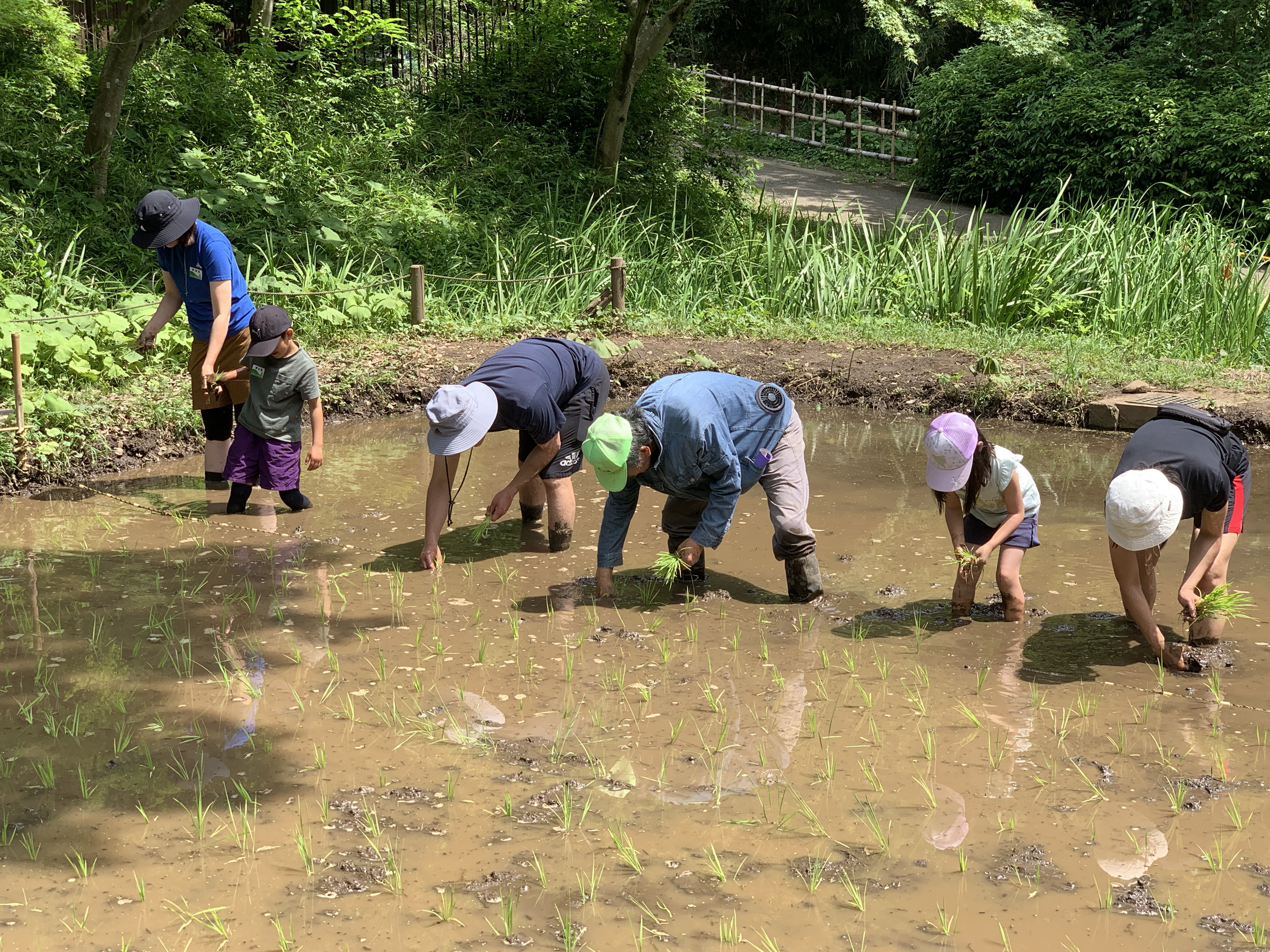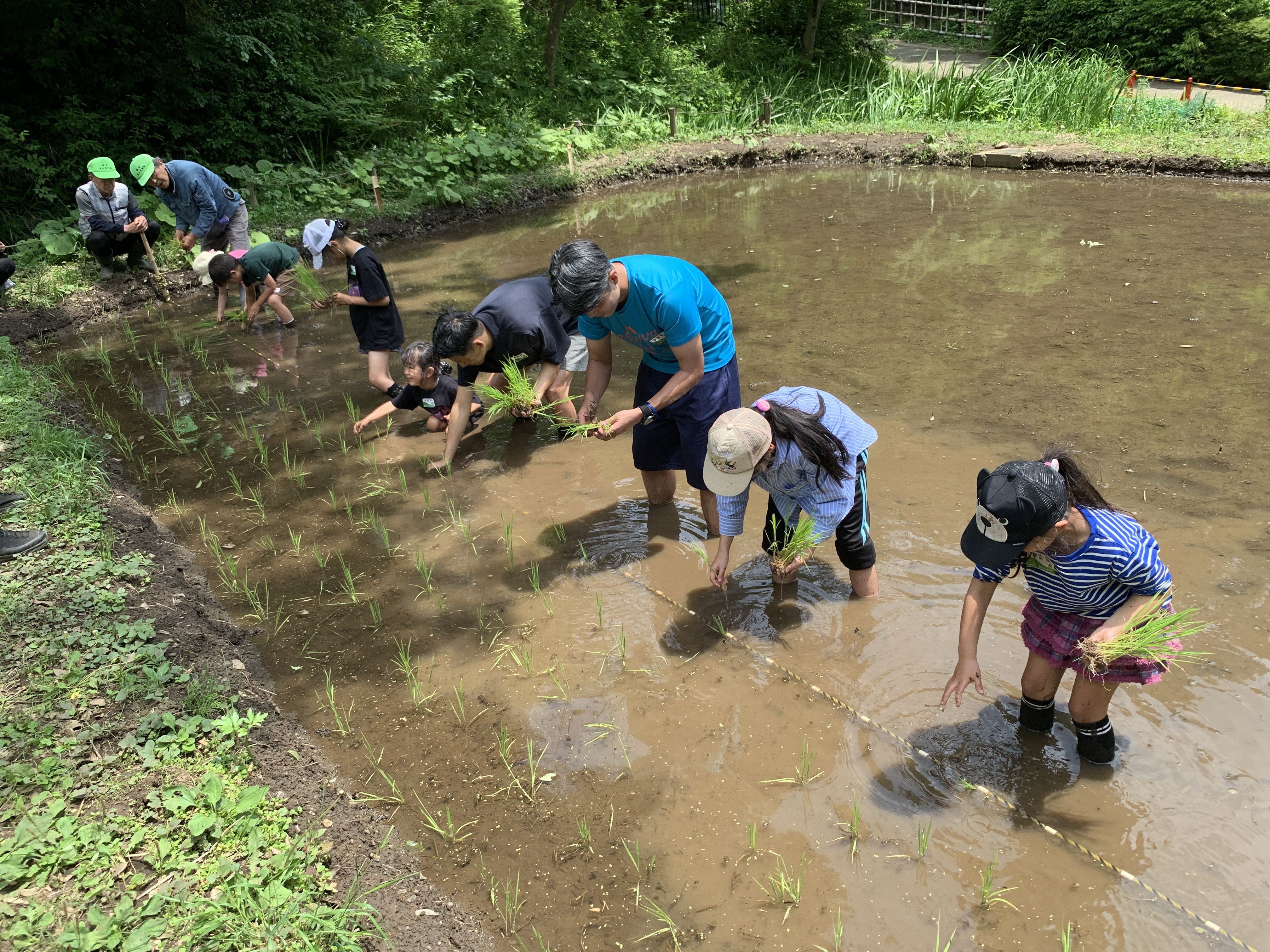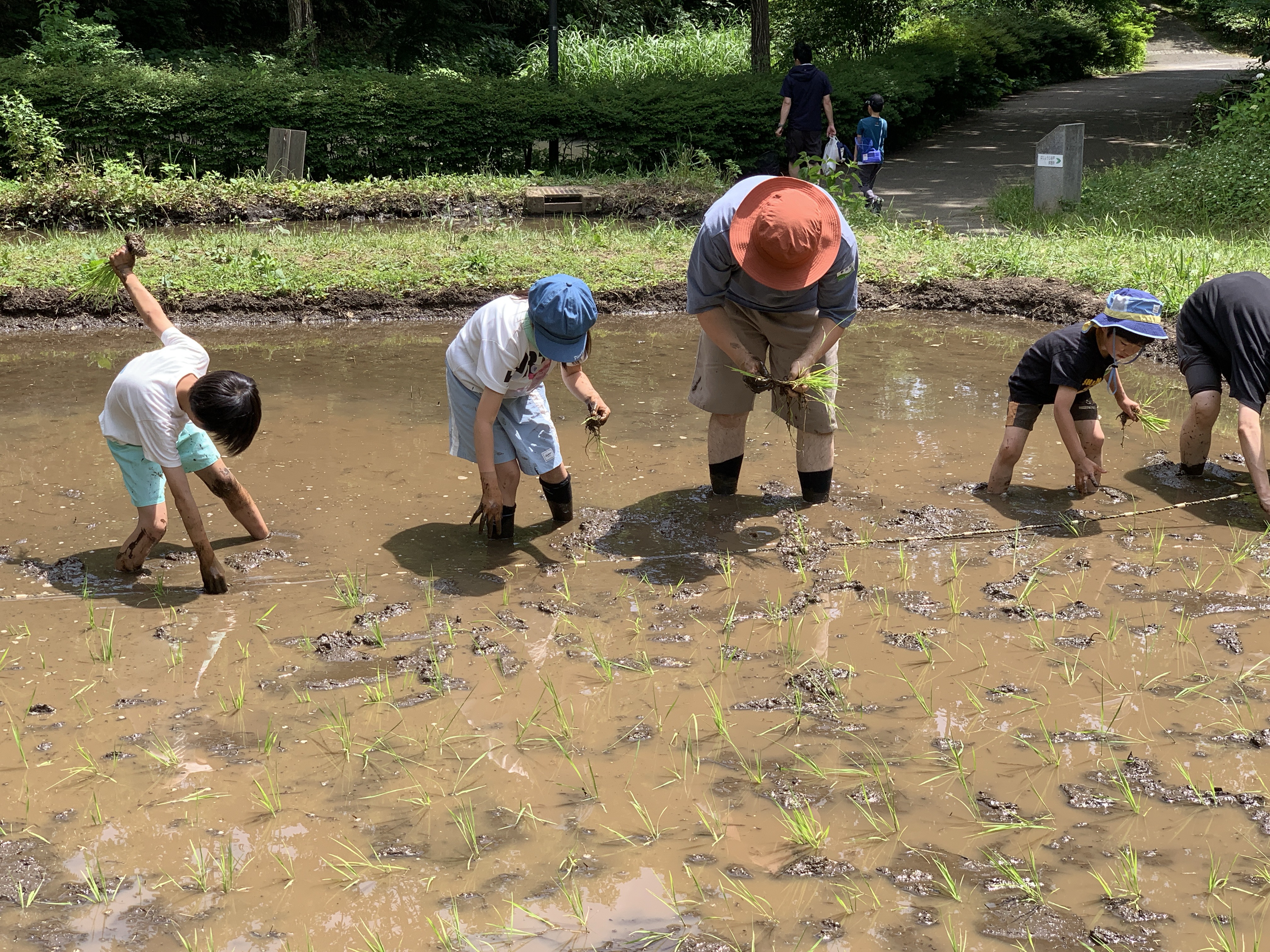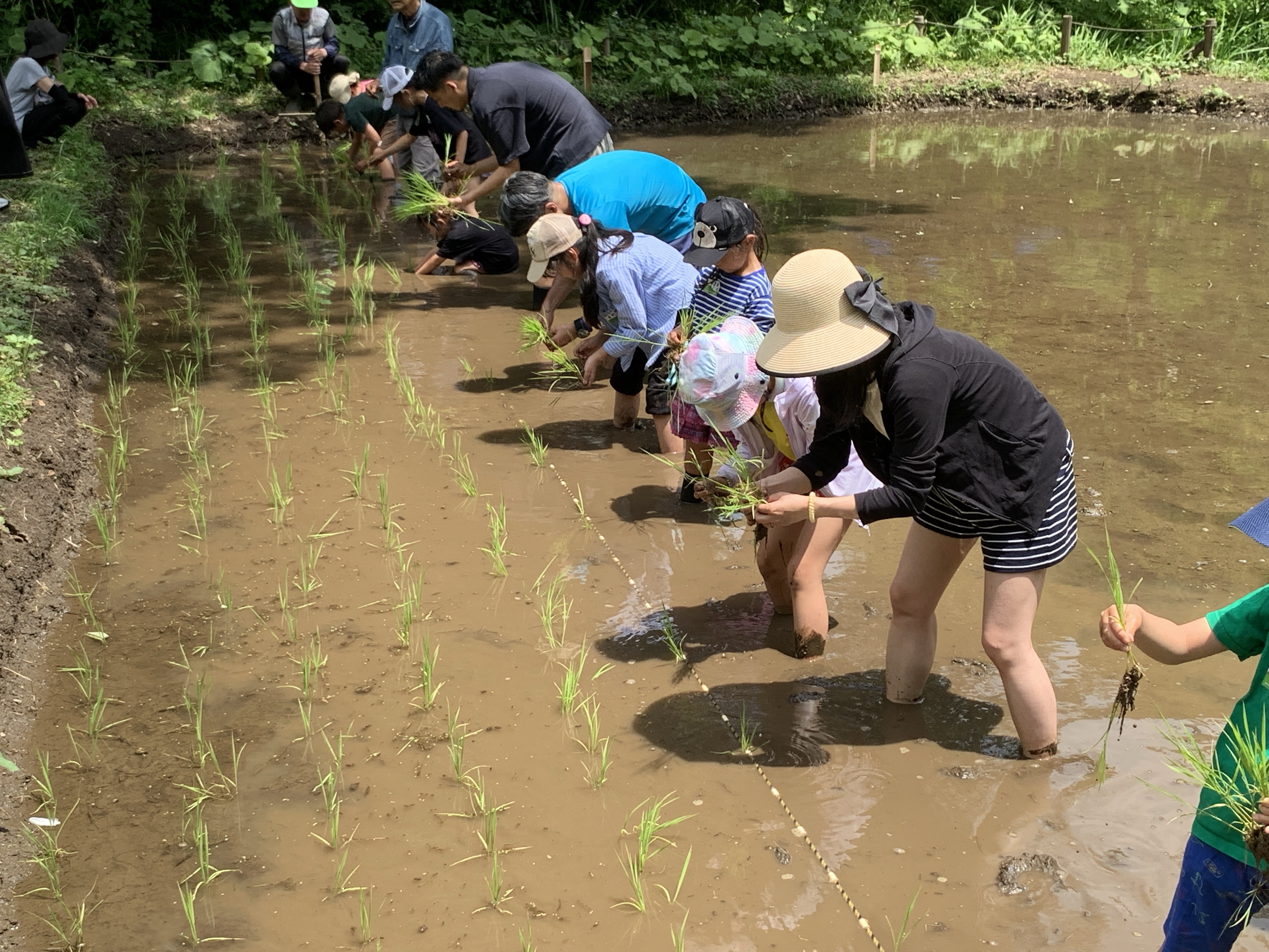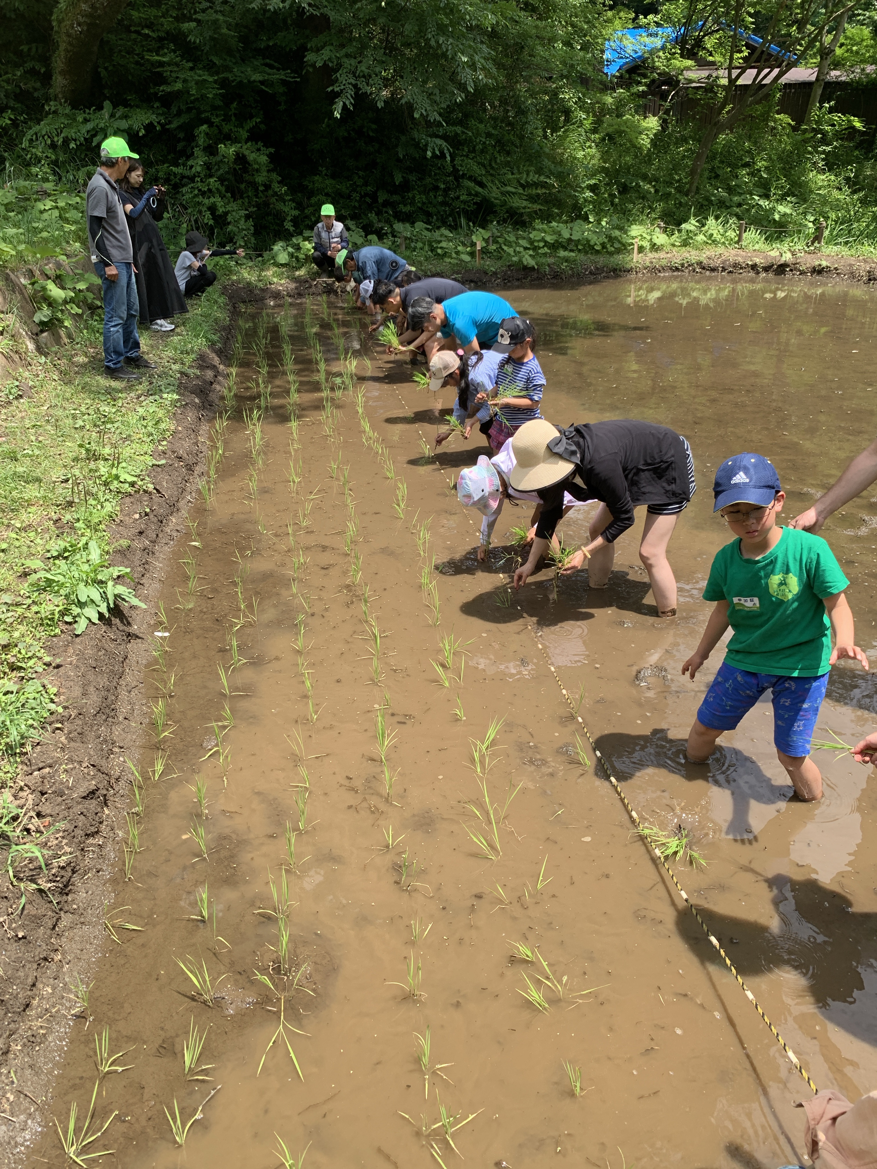 両手の幅を、後ろへ10歩ほどなので、畳一枚ほどの領域の田植えですが、足裏の感触や泥の臭い、腰を曲げての作業など、普段とはちがう経験だったと思います。最後に洗い場での水シャワーできれいにして、着替えて、終了となりました。