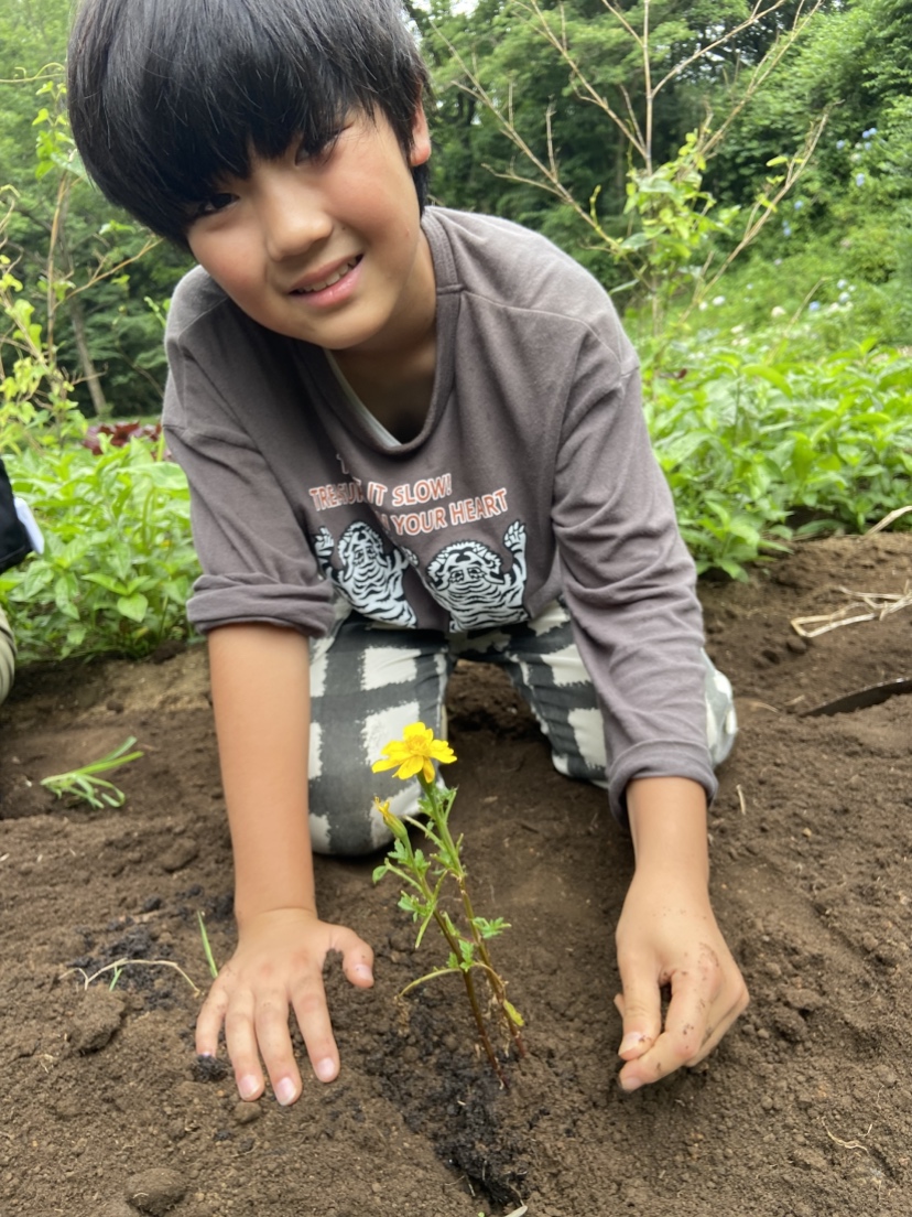 飲水タイムでひと呼吸のあと、掘ったジャガイモ畑にコンパニオンプランツのマリーゴールドの苗を植え、子供たちは順番にホースで散水をおこない、汗まみれ・泥まみれで終了となりました。