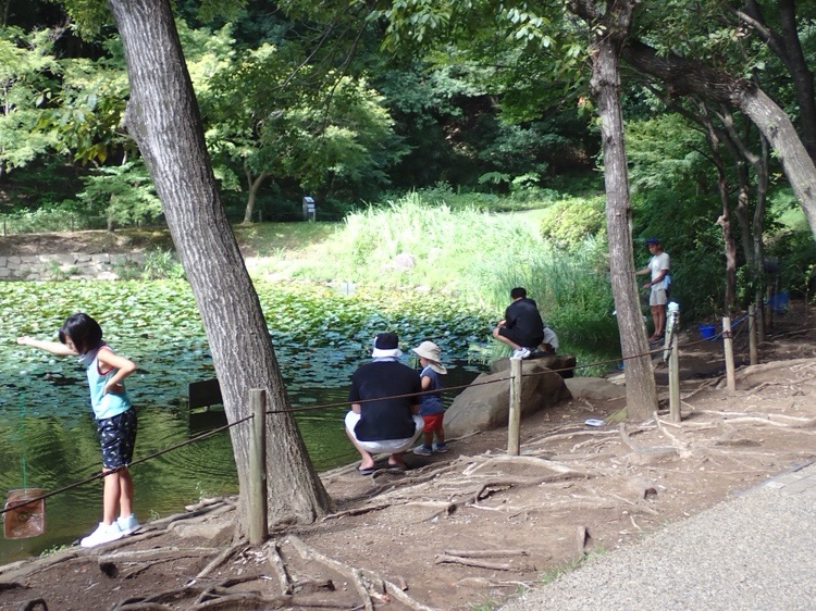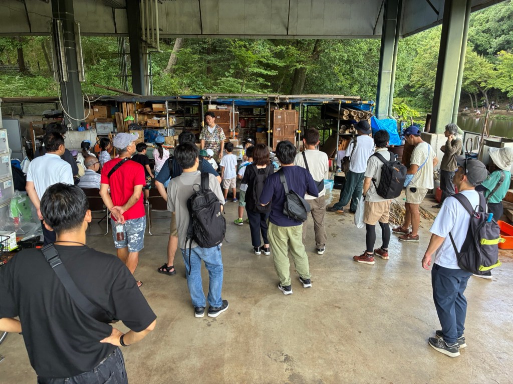 当日の天気は晴れ、参加者29名で観察会を開催しました。参加者の皆さんは、釣り竿、餌、バケツ、網かごを手に、大池に向かい、釣り糸を垂れ、網かごを仕掛けました。ザリガニ、スジエビ、小さな魚が採れました。