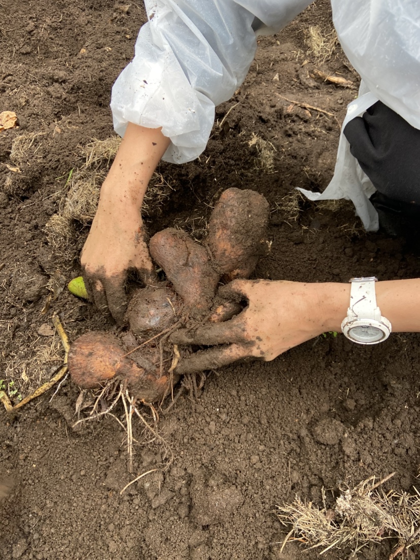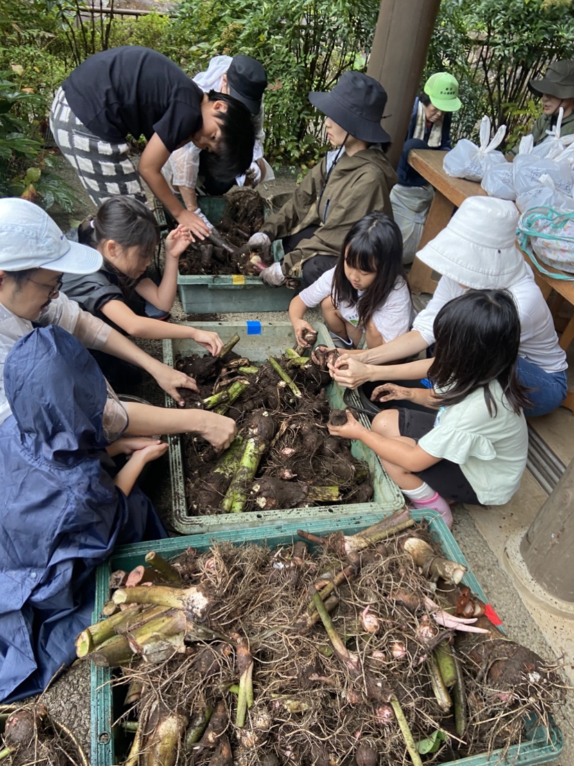 掘り終わると、集めたサトイモのまわりに輪になって、親芋子芋孫芋を分離、細いひげのような根っこを取り除きます。全ての作業が終わるころには、爪の間も泥でまっくろ、空模様とは反対に顔は笑顔でいっぱいでした。 M.S.