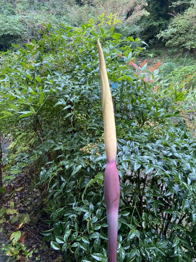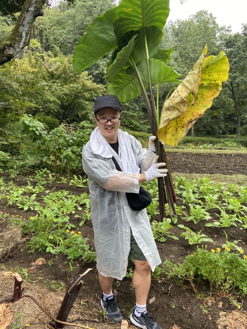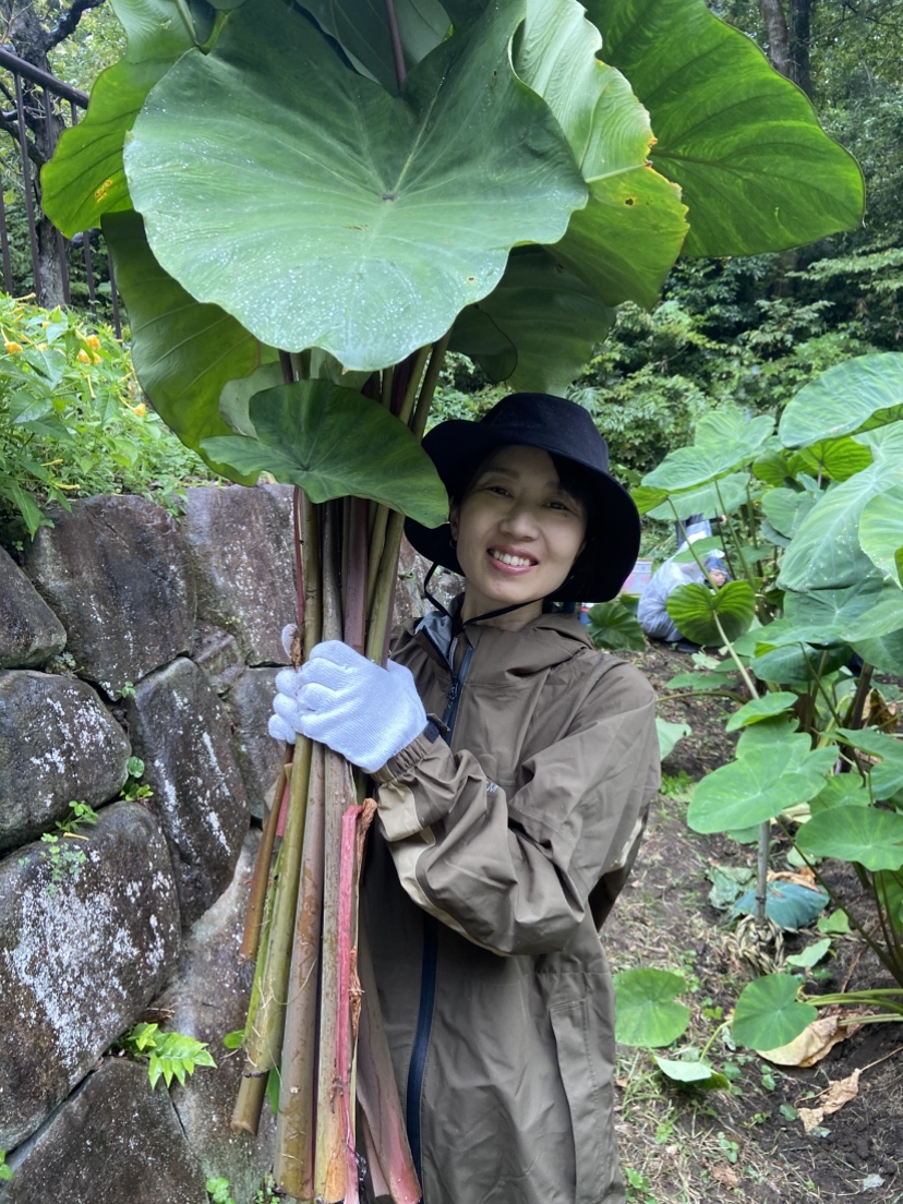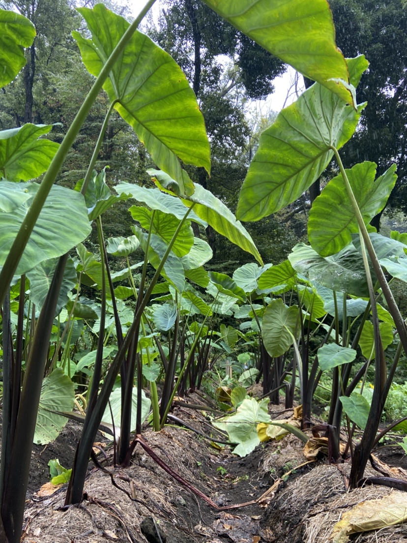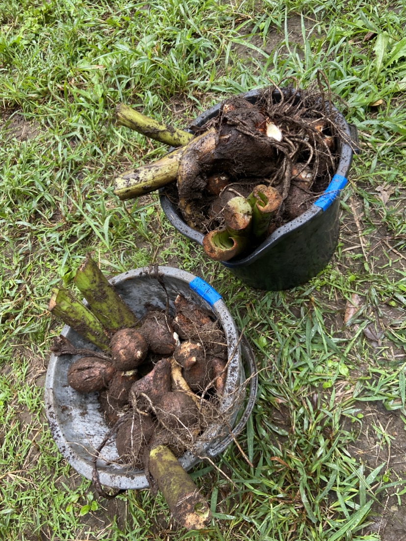子供の背丈ほどに伸びた茎を鋸鎌で地面から10㎝ほどの高さに切り、茎をもって引き上げると、雨でぬれて泥がついてなんと重いこと。すぐにバケツがいっぱいになって集積所であるレストハウスの屋根の下に運び込みます。