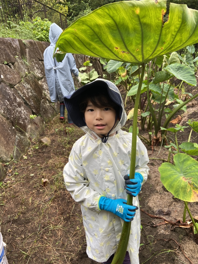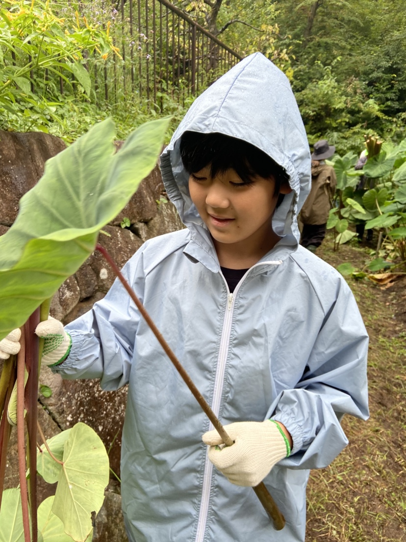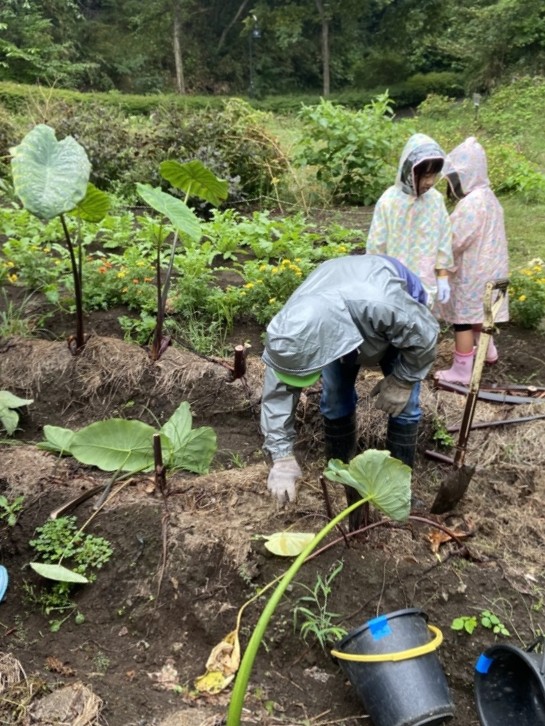 あいにくの小雨模様でしたが、応募者全員が合羽持参で集合、気合十分でサトイモ掘りが始まりました。