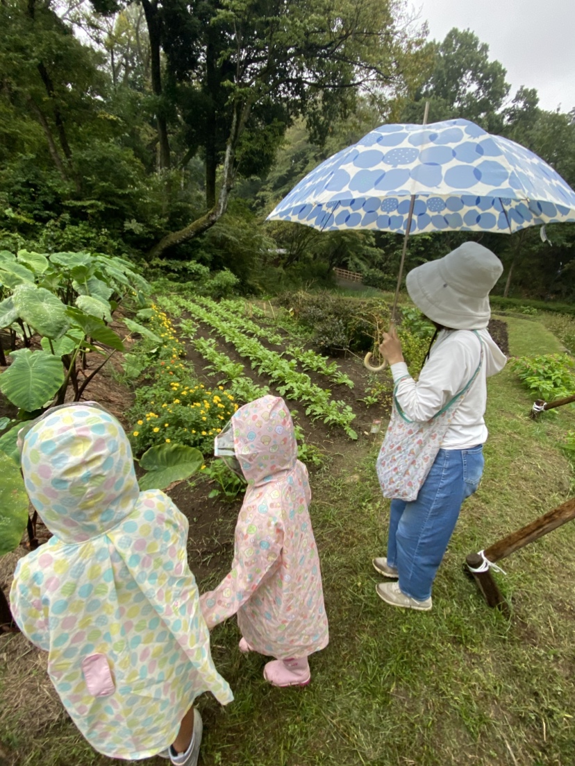 さあ畑に移動だ~みんな雨の準備もバッチリ。