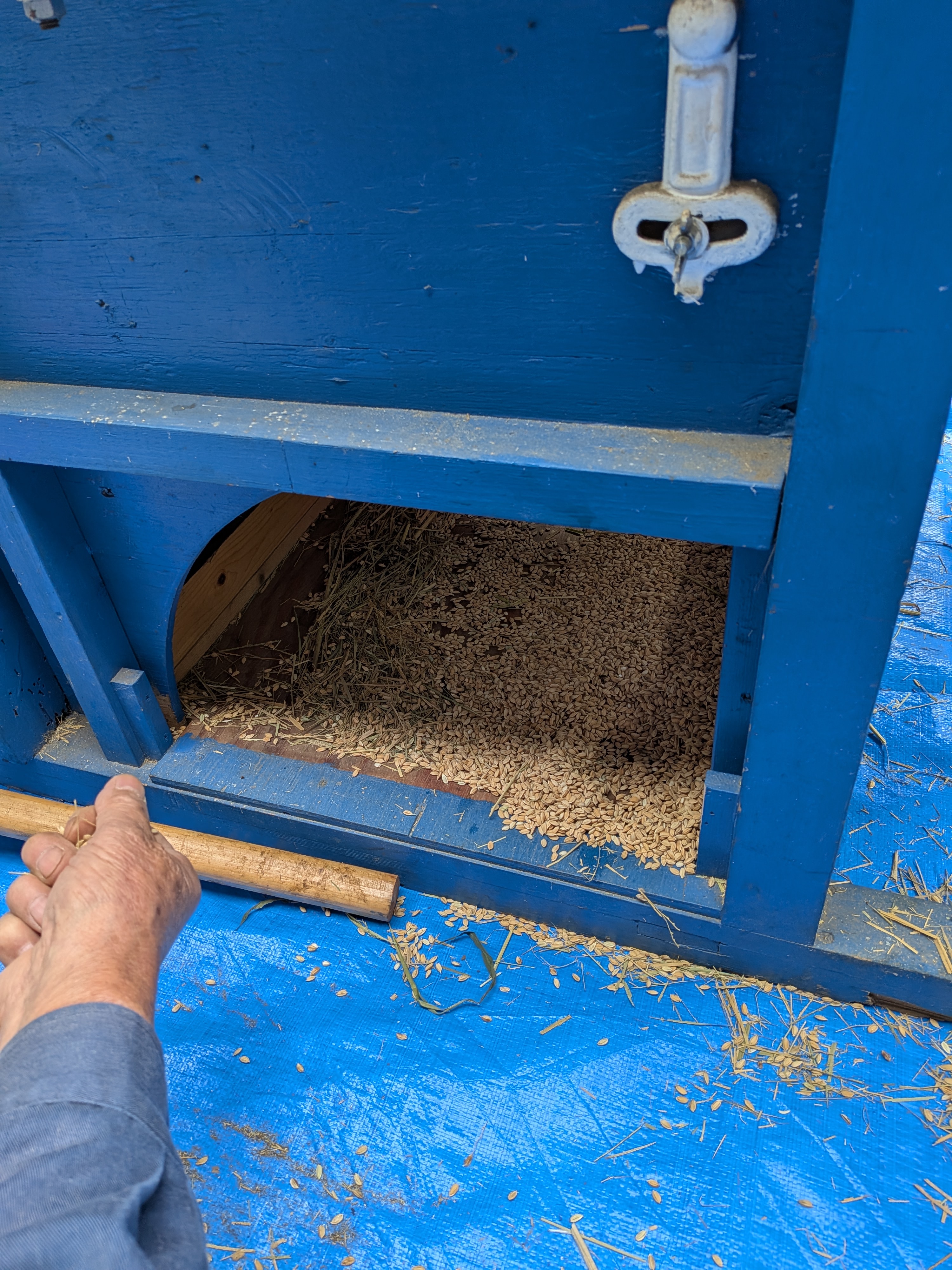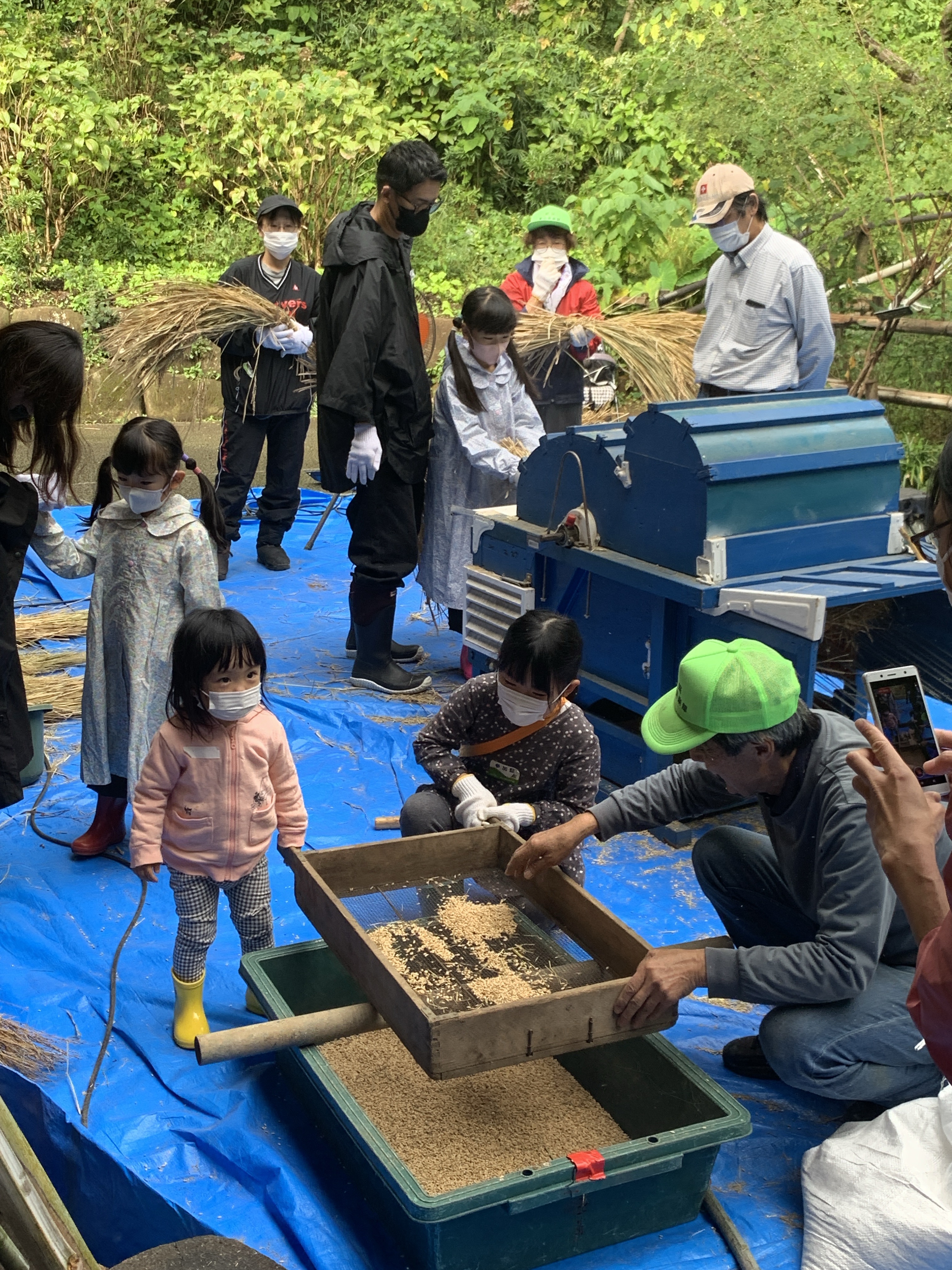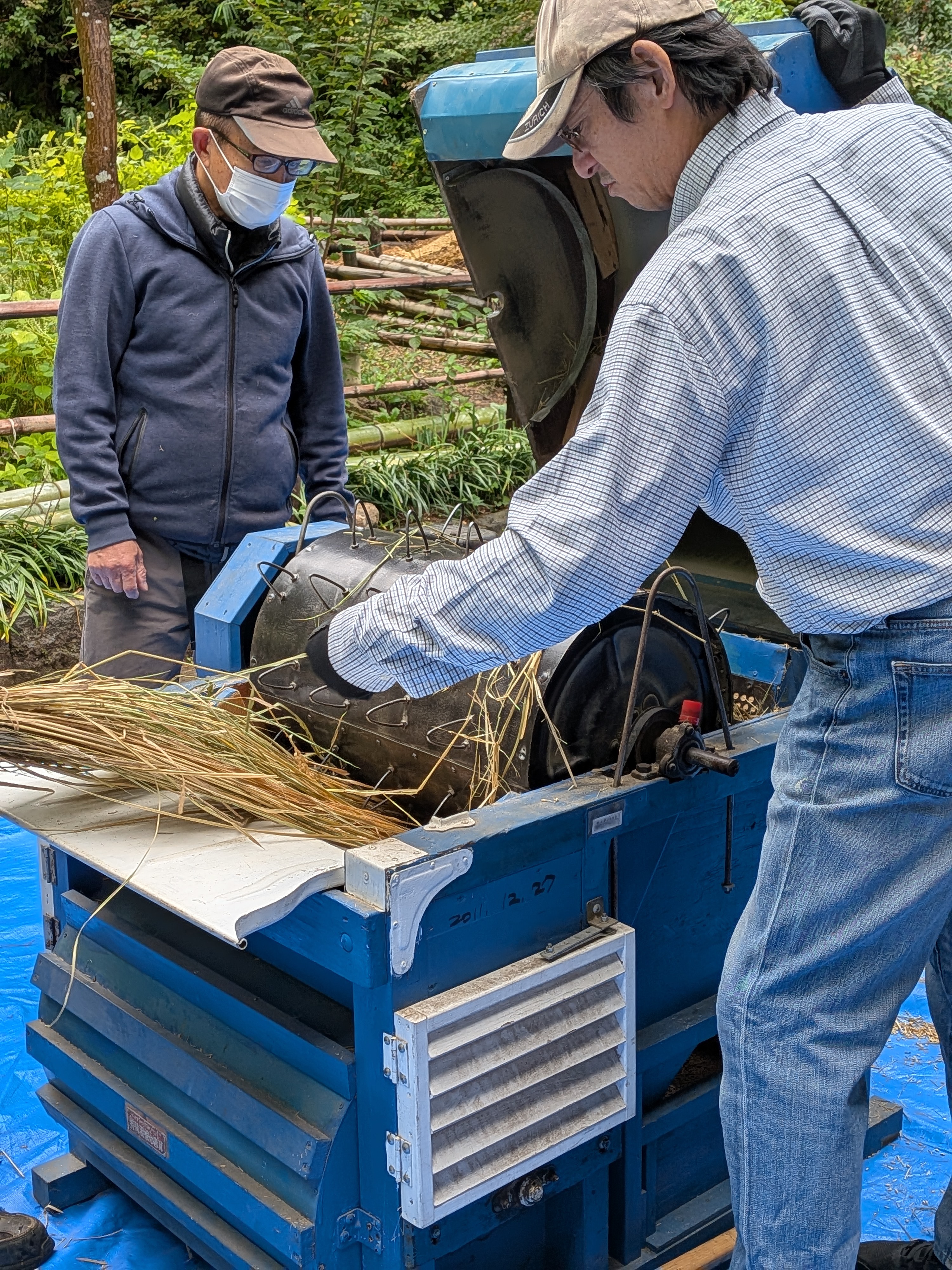グァングァンというエンジン音にちょっとビビりますが、教えてもらった通りゆっくりと稲束を入れて5秒、裏返してまた5秒、稲穂の米粒がきれいに取れて脱穀完了。脱穀機のお尻からは取れた米粒がどんどん飛んできてたまります。それをふるいにかけてゴロゴロ、枝葉をのぞいて米粒だけを米俵ならぬ米袋に。収穫量は45㎏ほどになり、ネズミやコジュケイに盗み食いされたわりにはほぼ平年並みとなりました。