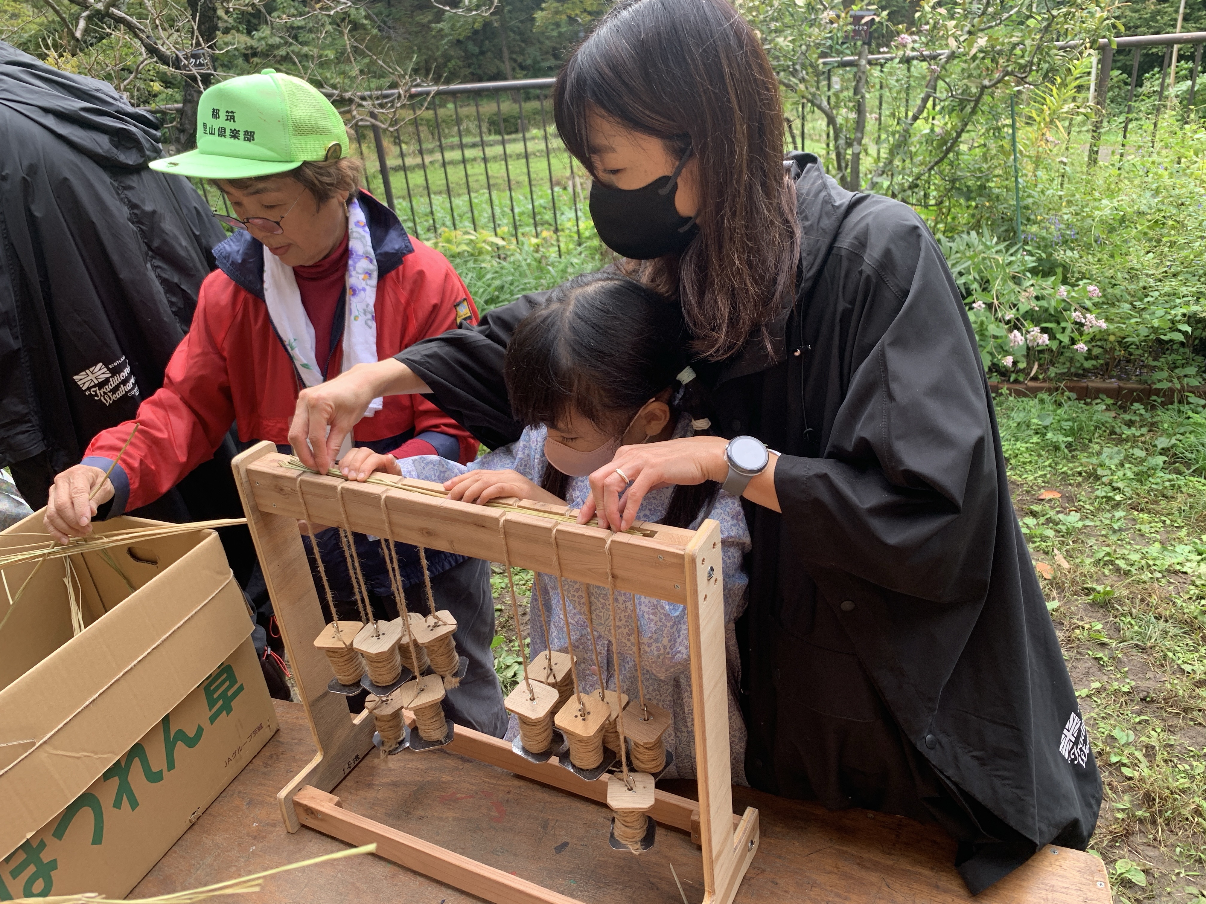 後半は、藁を使ってのこも編み。作業台の上に置かれた編み機は、小学低学年には背のびしてもちょっと高すぎ、踏み台の助けを借りて夢中で編み上げました。