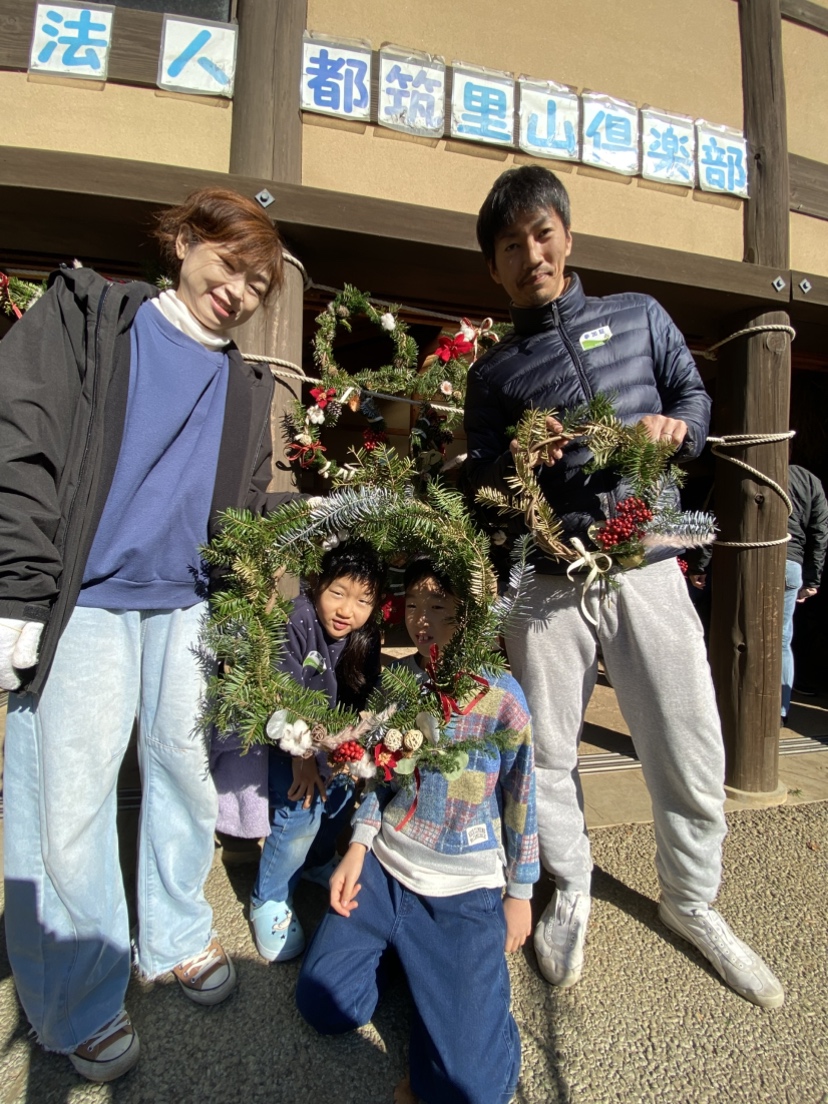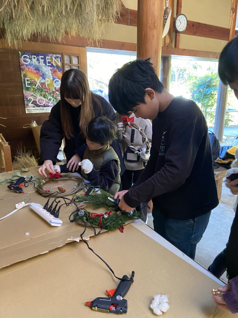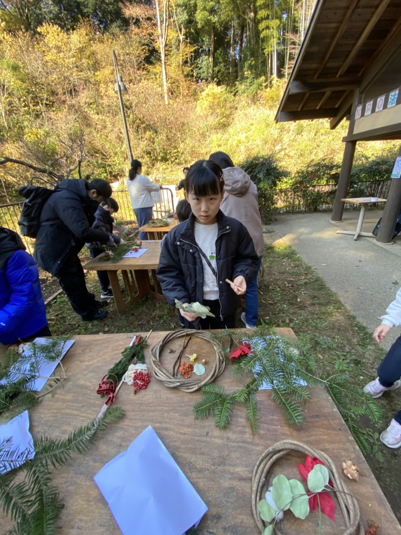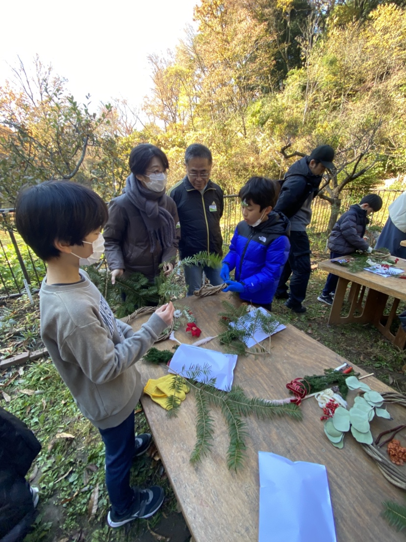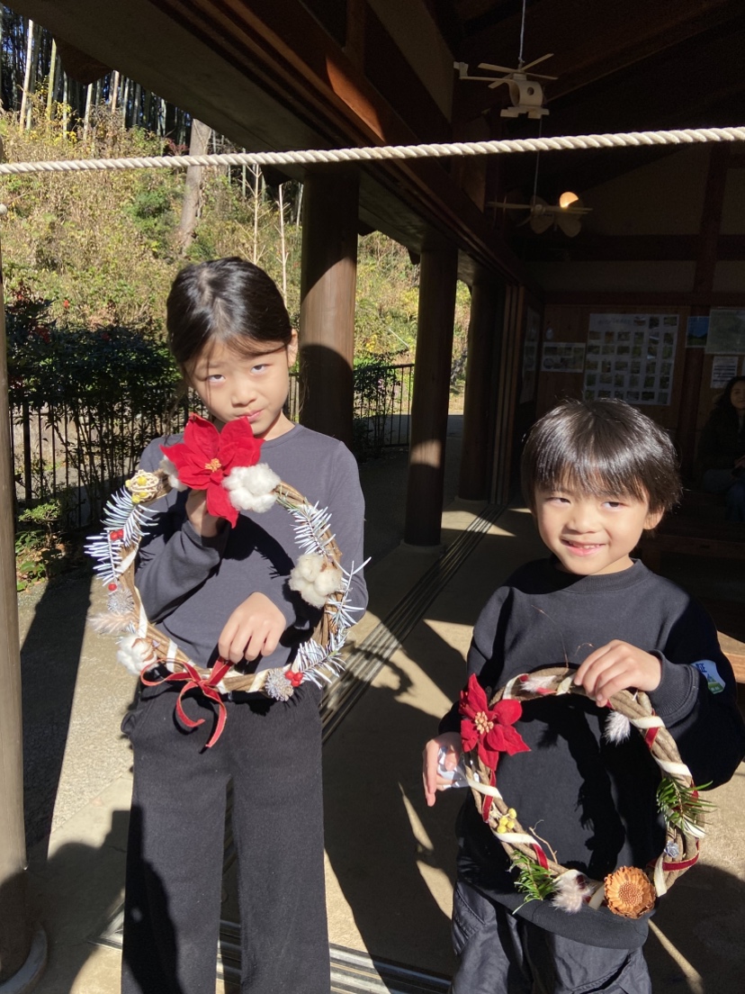 雪の便りも届く冬らしく寒い日にクリスマスの準備、リース作りを行いました。園内で集めたクズの蔓、緑豊かなモミの枝、松ぼっくり、クヌギの実に加えてクリスマスらしいナチュラル系の飾りを使ってリースに仕上げていきます。