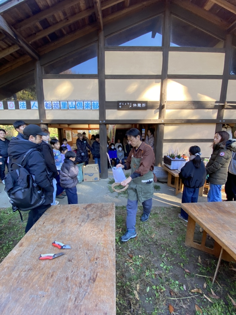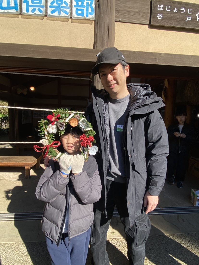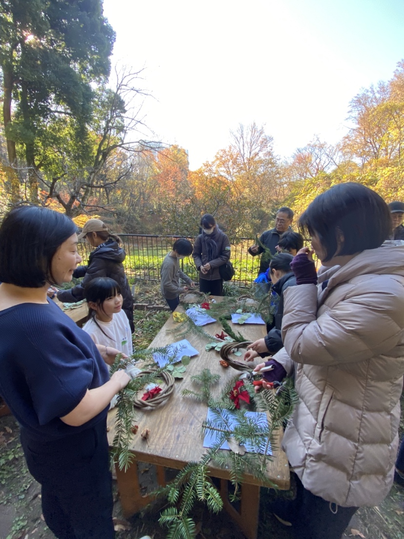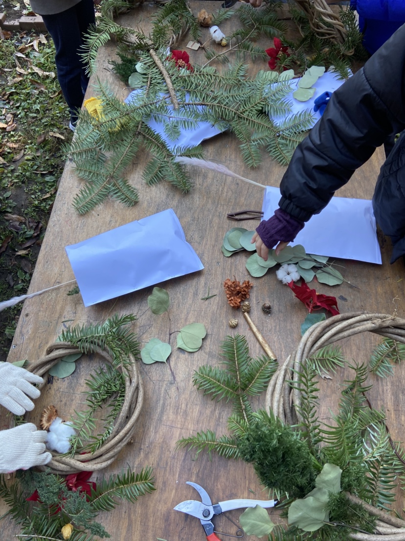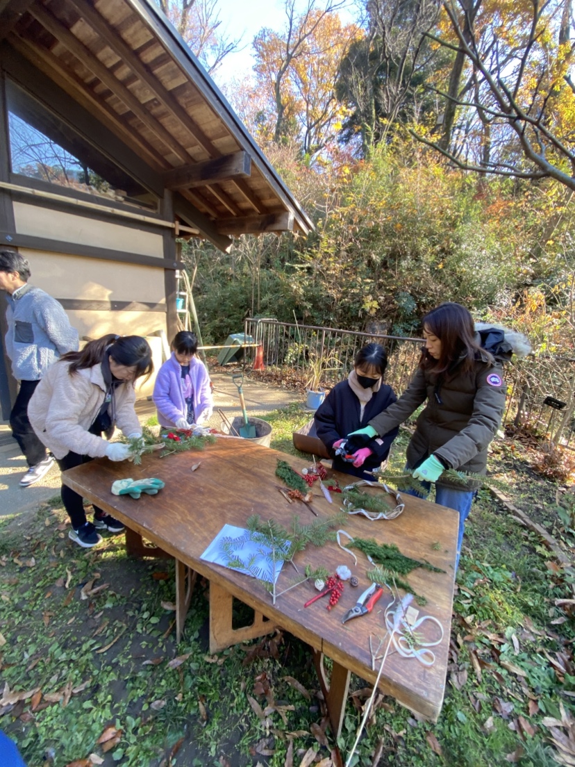 雪の便りも届く冬らしく寒い日にクリスマスの準備、リース作りを行いました。園内で集めたクズの蔓、緑豊かなモミの枝、松ぼっくり、クヌギの実に加えてクリスマスらしいナチュラル系の飾りを使ってリースに仕上げていきます。