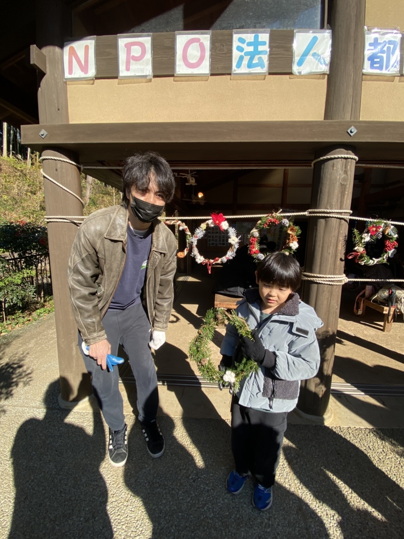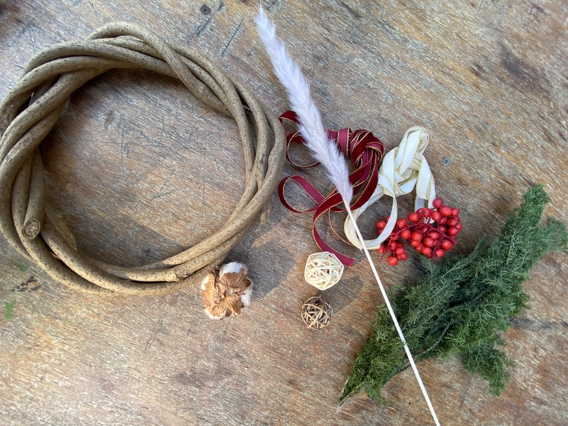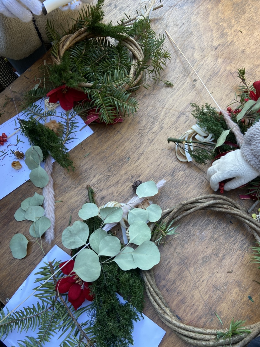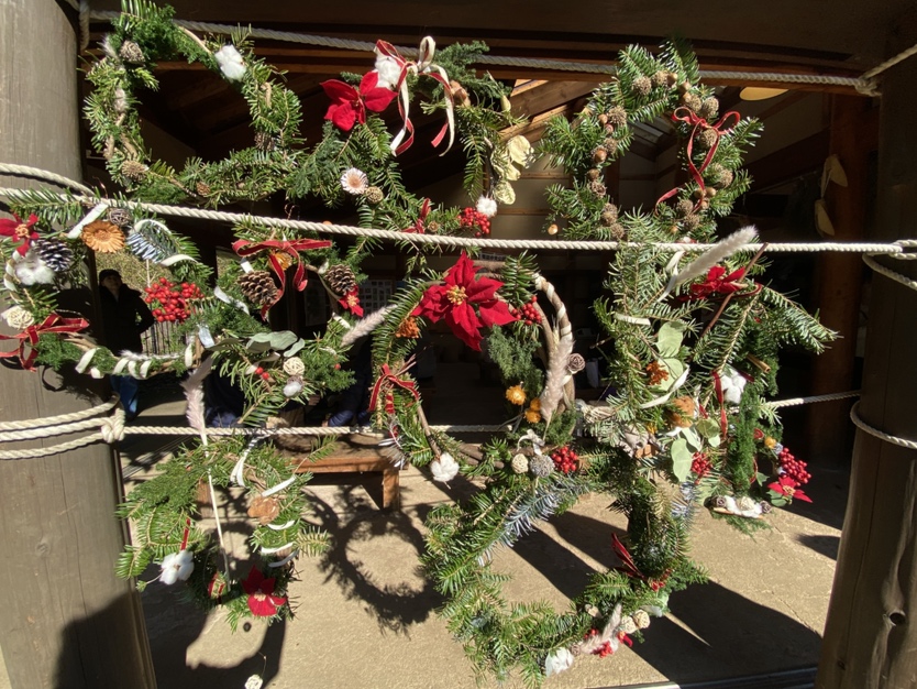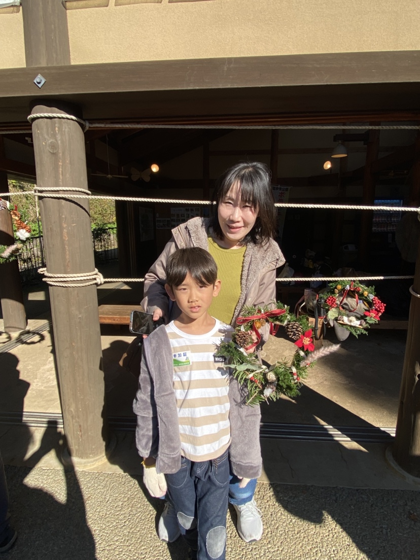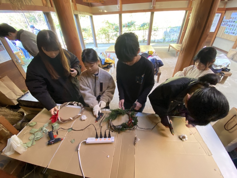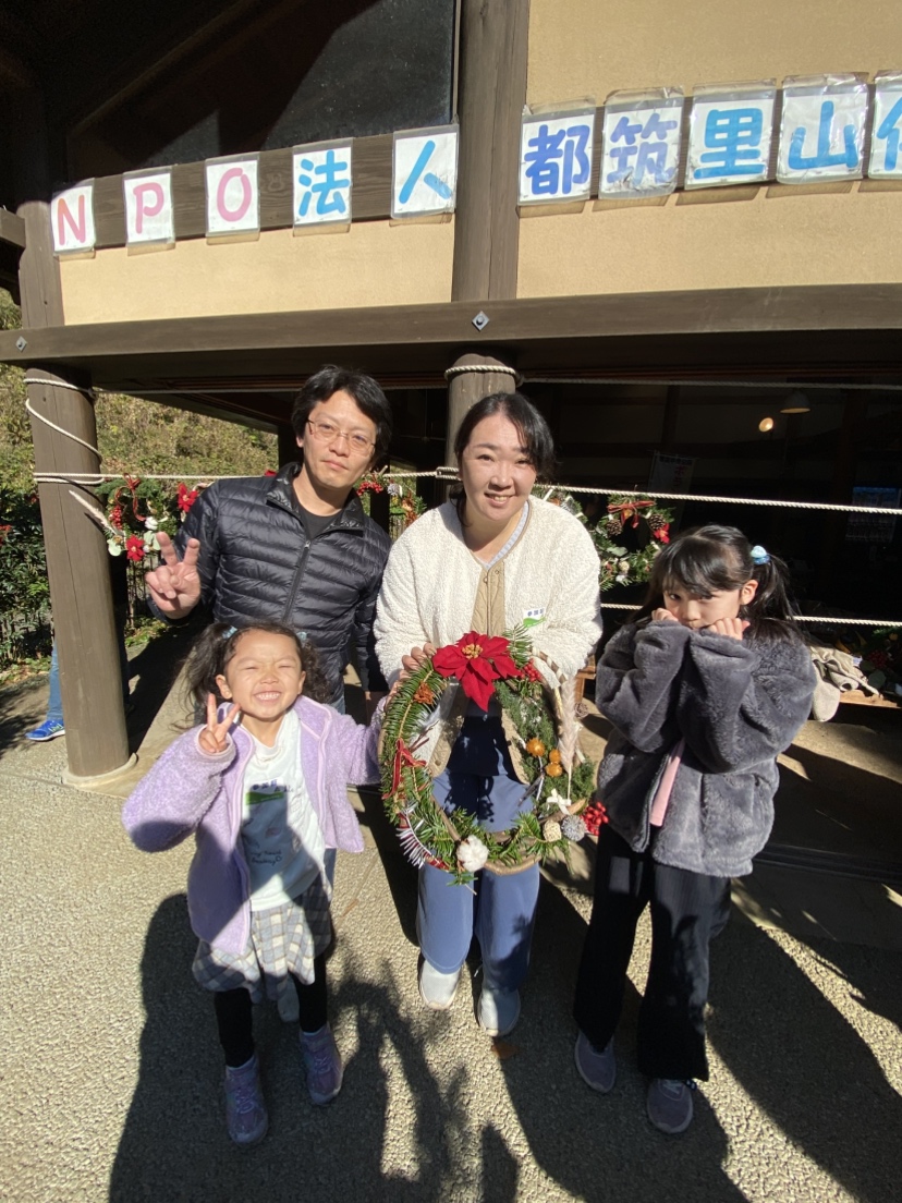 雪の便りも届く冬らしく寒い日にクリスマスの準備、リース作りを行いました。園内で集めたクズの蔓、緑豊かなモミの枝、松ぼっくり、クヌギの実に加えてクリスマスらしいナチュラル系の飾りを使ってリースに仕上げていきます。