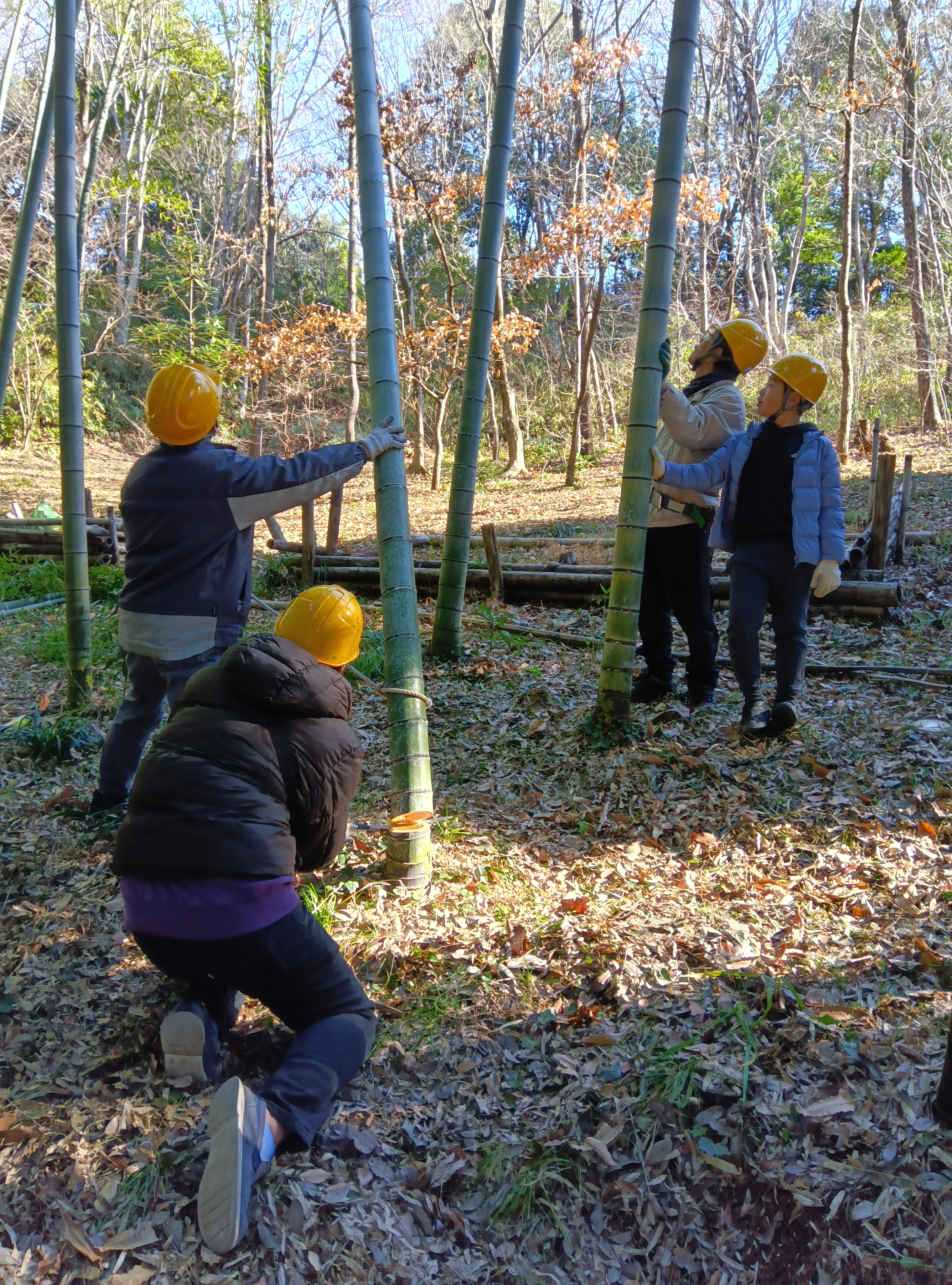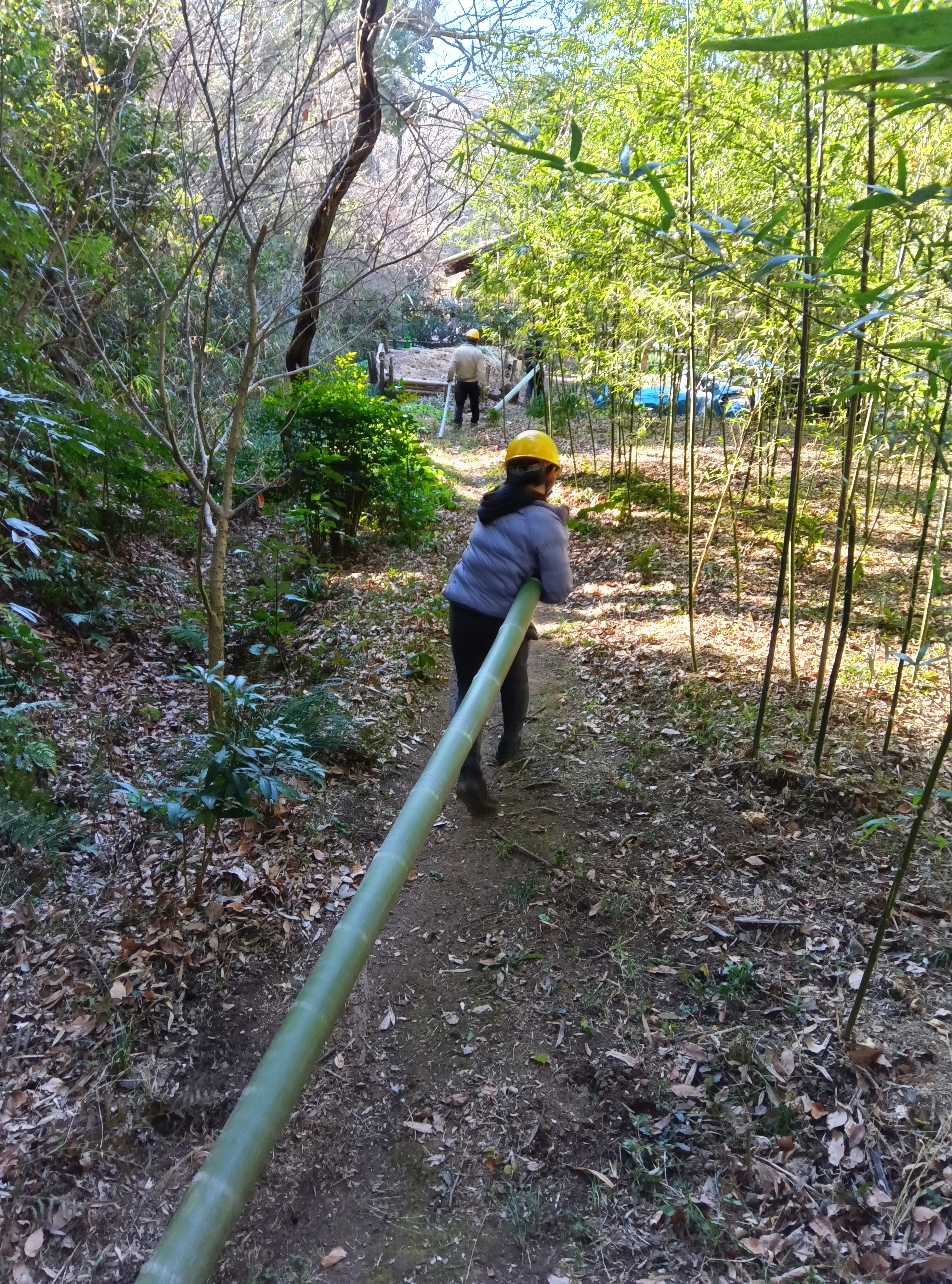 4年生の男子、初めは鋸の使い方も余計な力が入って上手く引けなかったのが、教えてもらううちにどんどん上達し、大きな竹を伐採・枝払い・3mに玉切りを無事完了。普段は我が子の出来を見ているだけのお父さんも、太めの竹を伐採して同様の体験。
