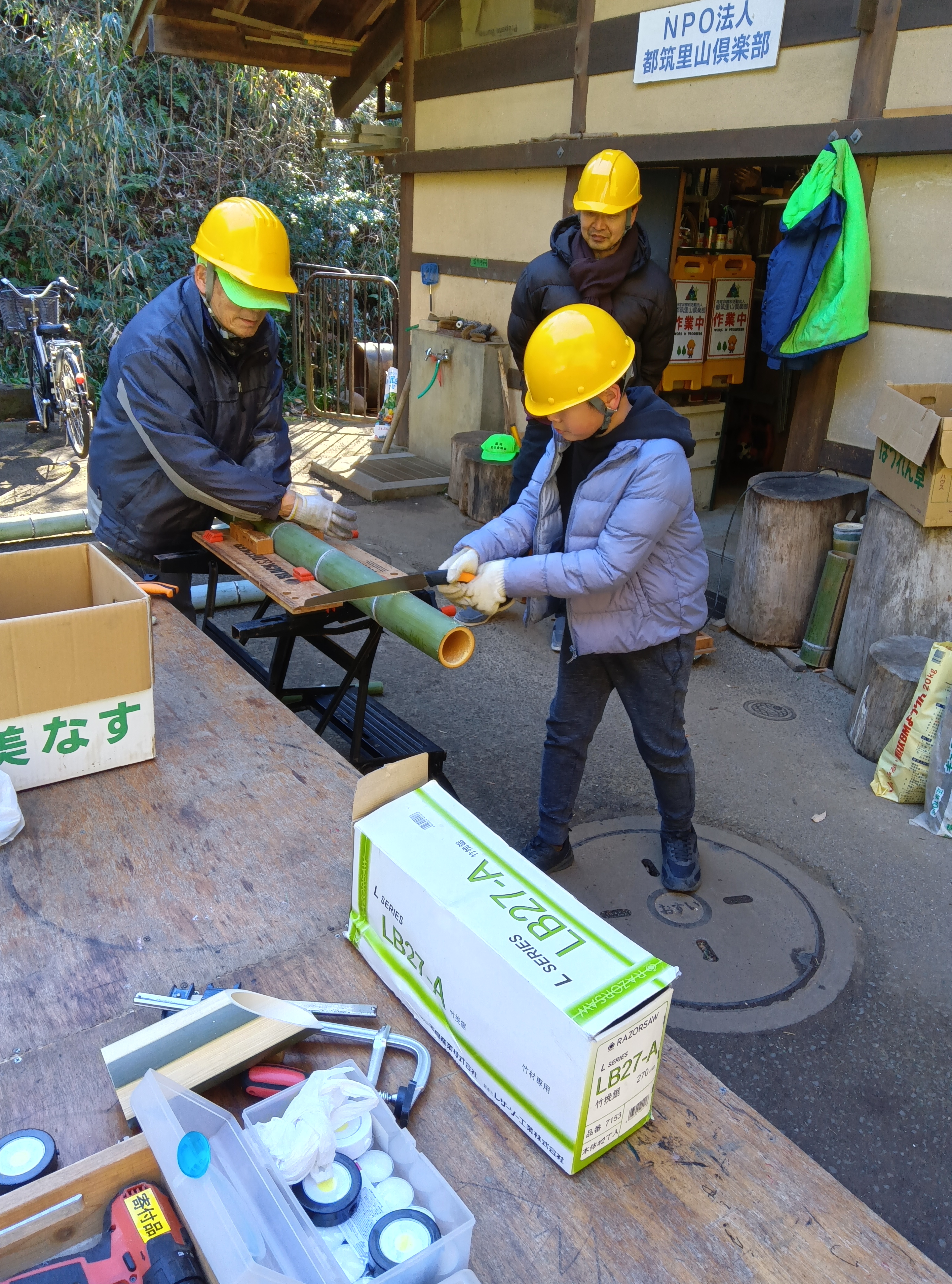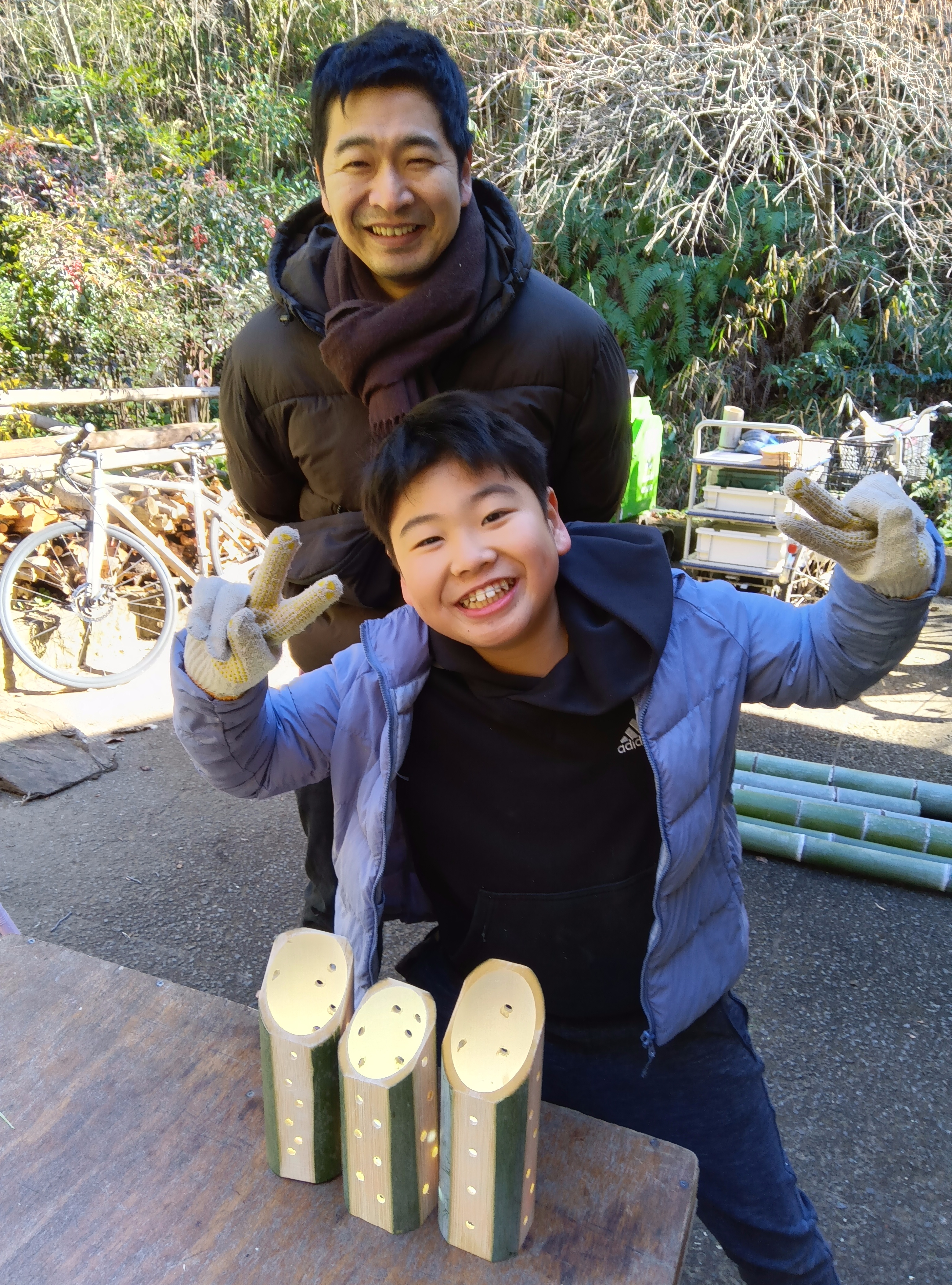 後半の時間は自分で切った竹を使っての燈籠づくり、いやネーミングを改めて、竹のキャンドルづくり。家で待つお母さんのぶんも含めて3個の竹キャンを作って満足の体験学習でした。 S.M.