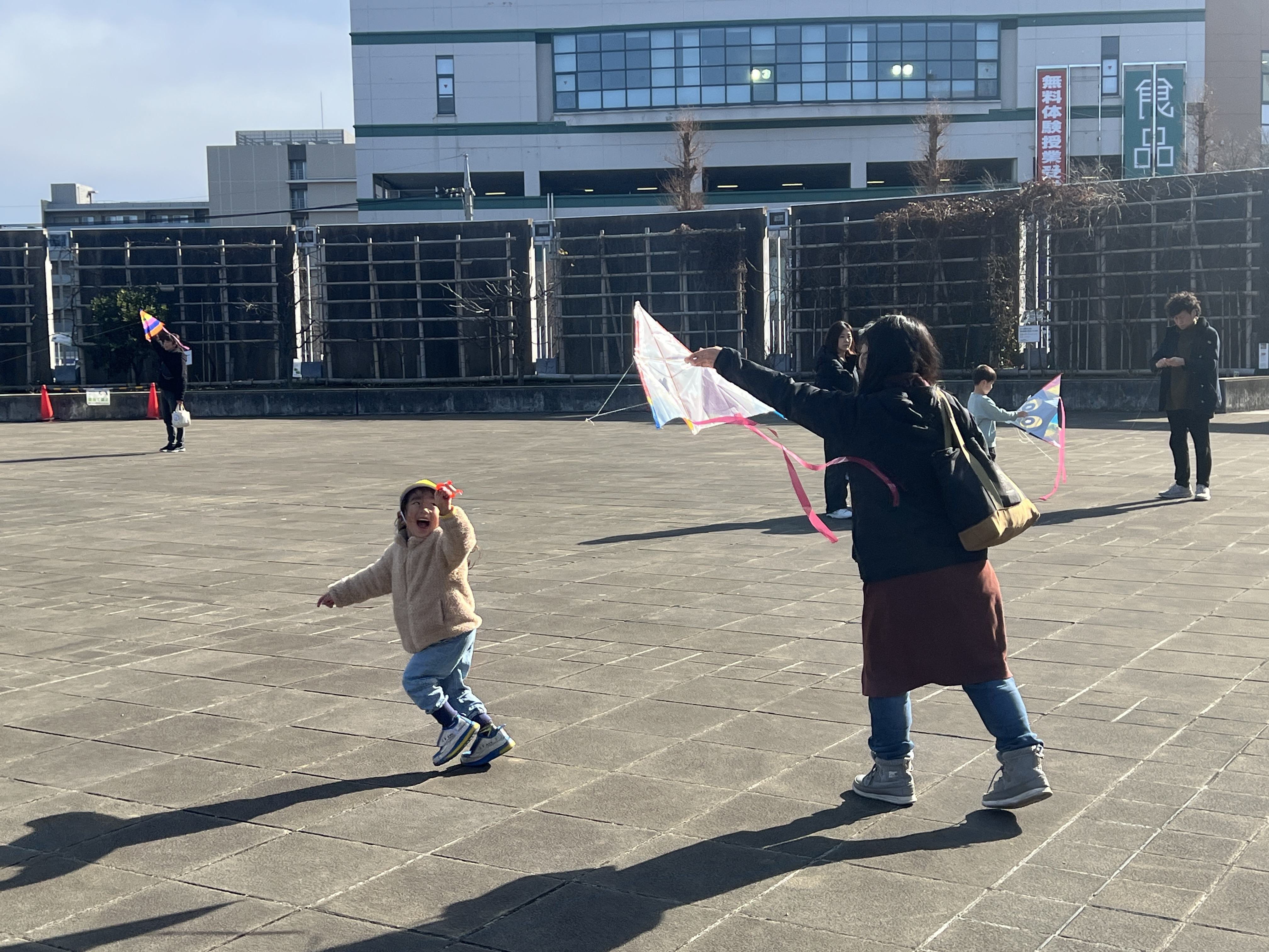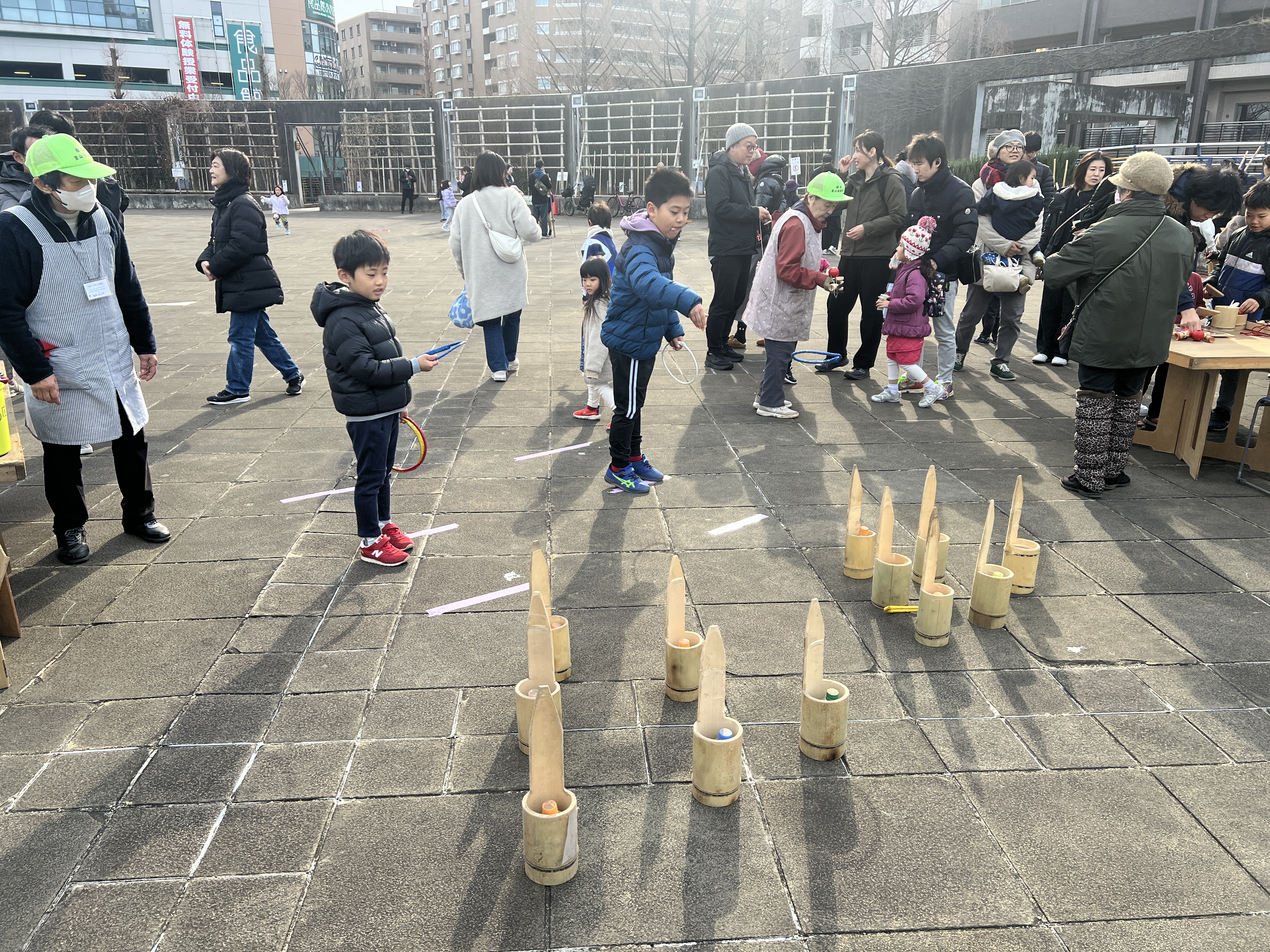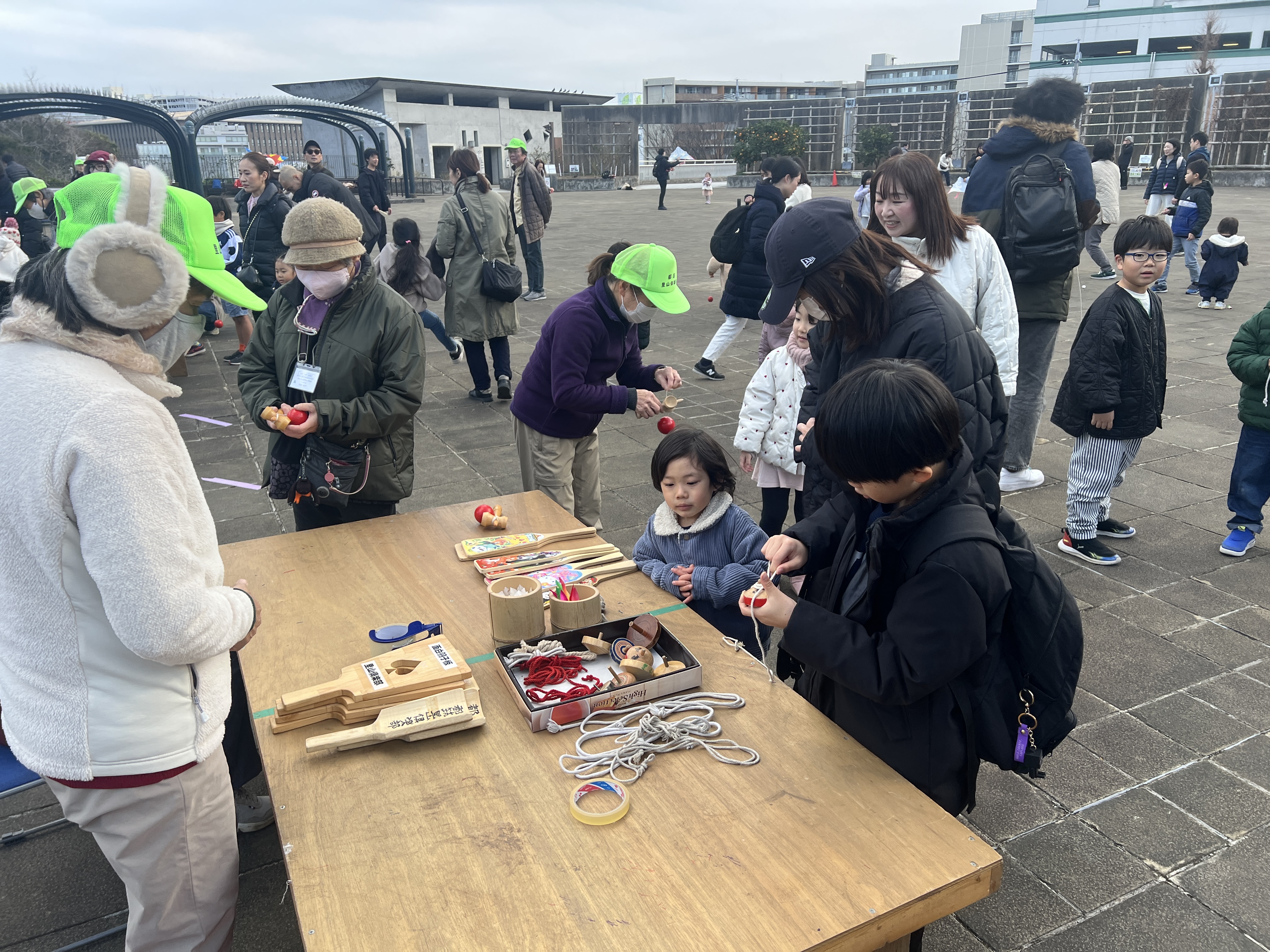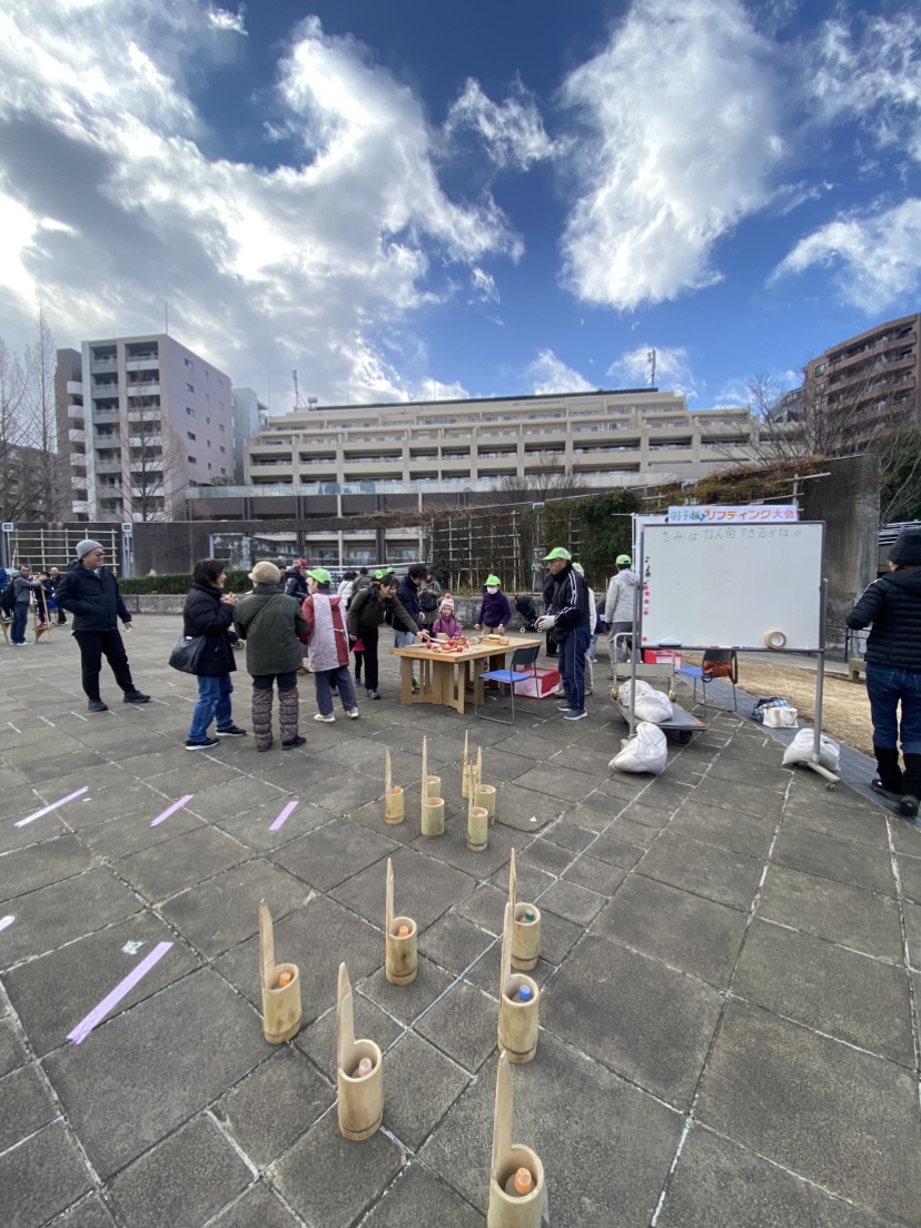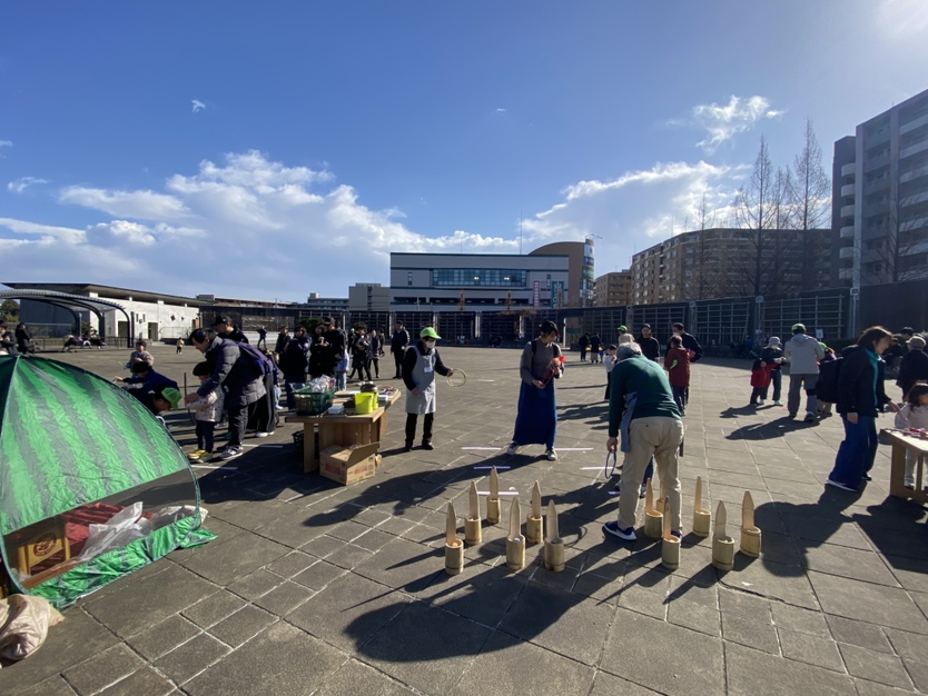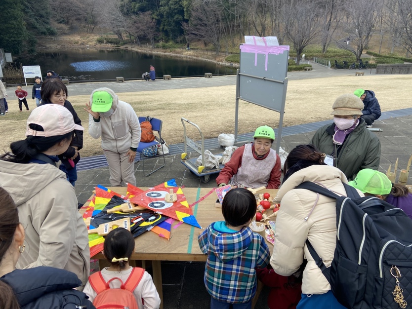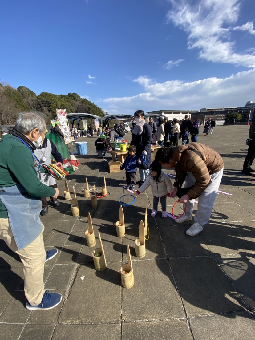 寒風吹く冬の日、昔懐かしい外遊びを楽しみに多くの親子が集まりました。凧上げは不動の人気アイテム、手に取るとすぐに走り出す子供たち。寒さもおかまいなし!の風景があちこちで観られました。
