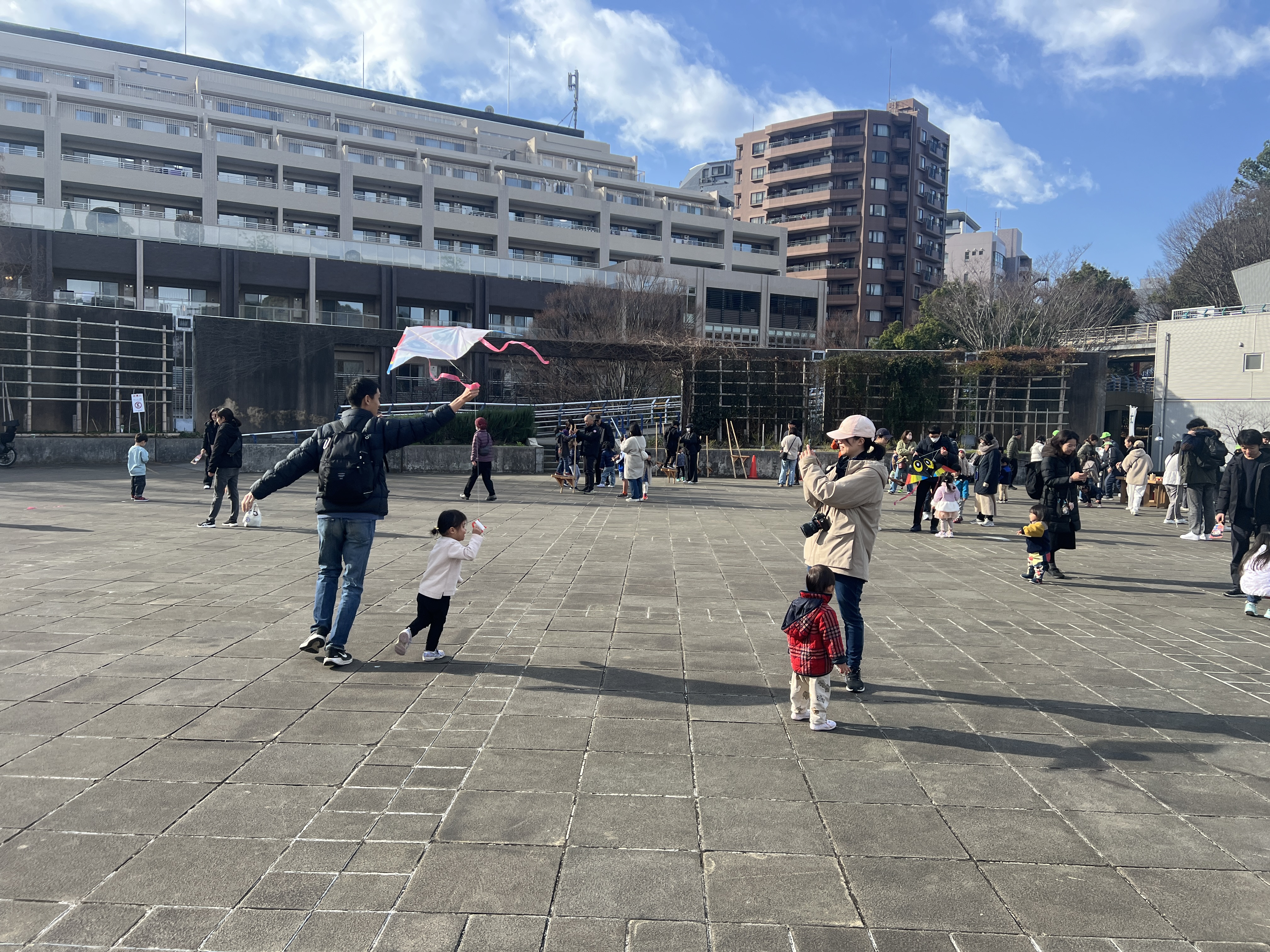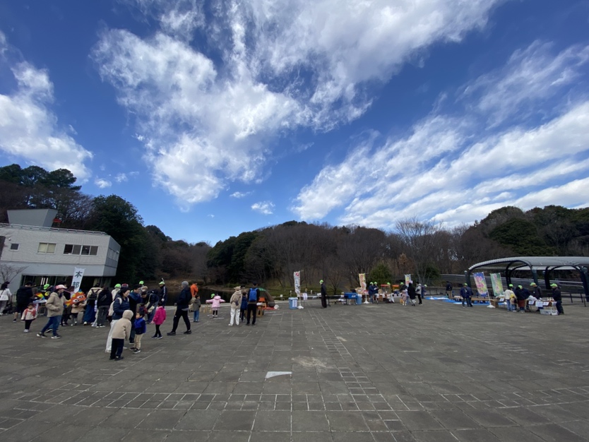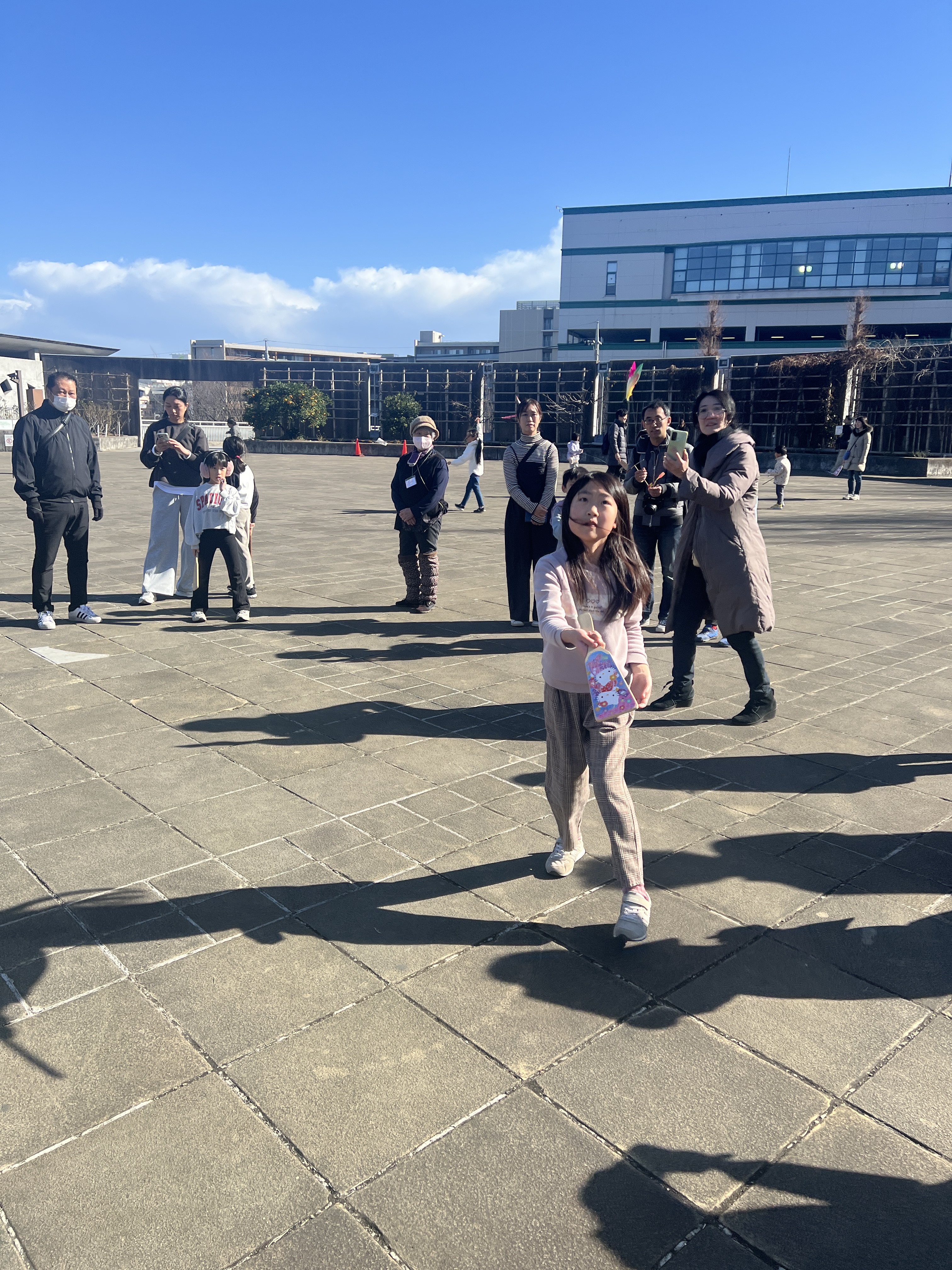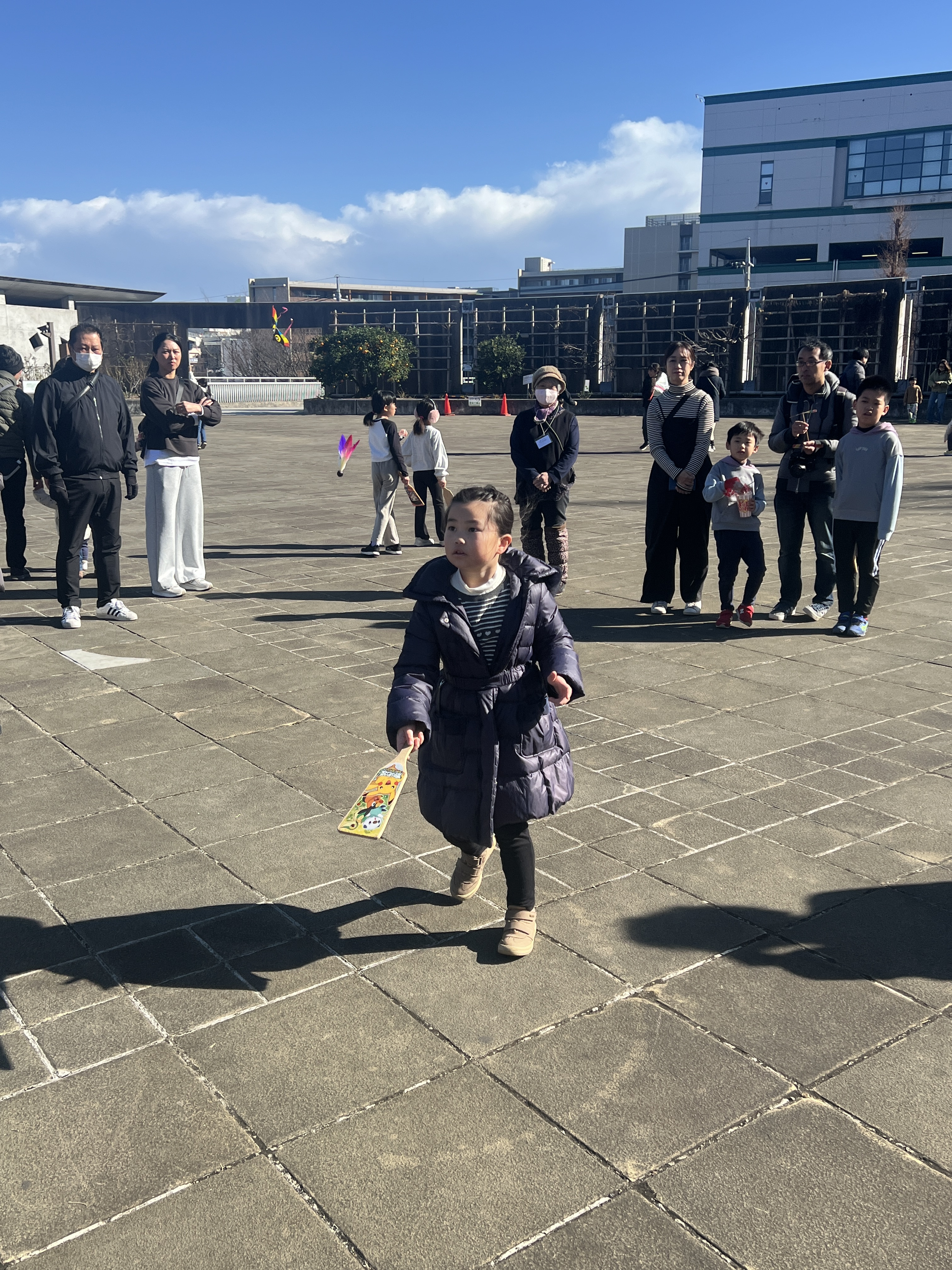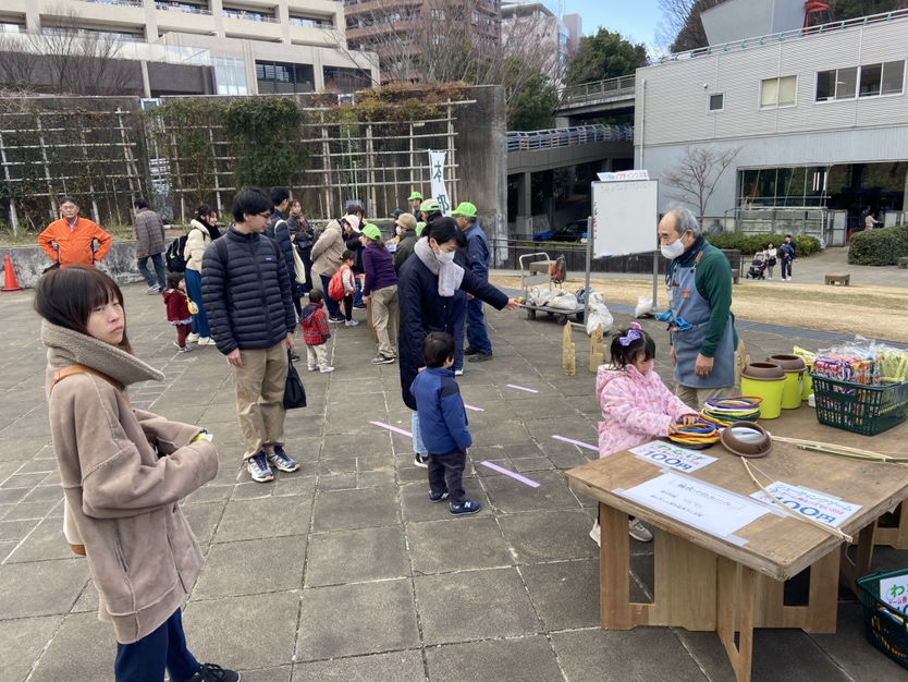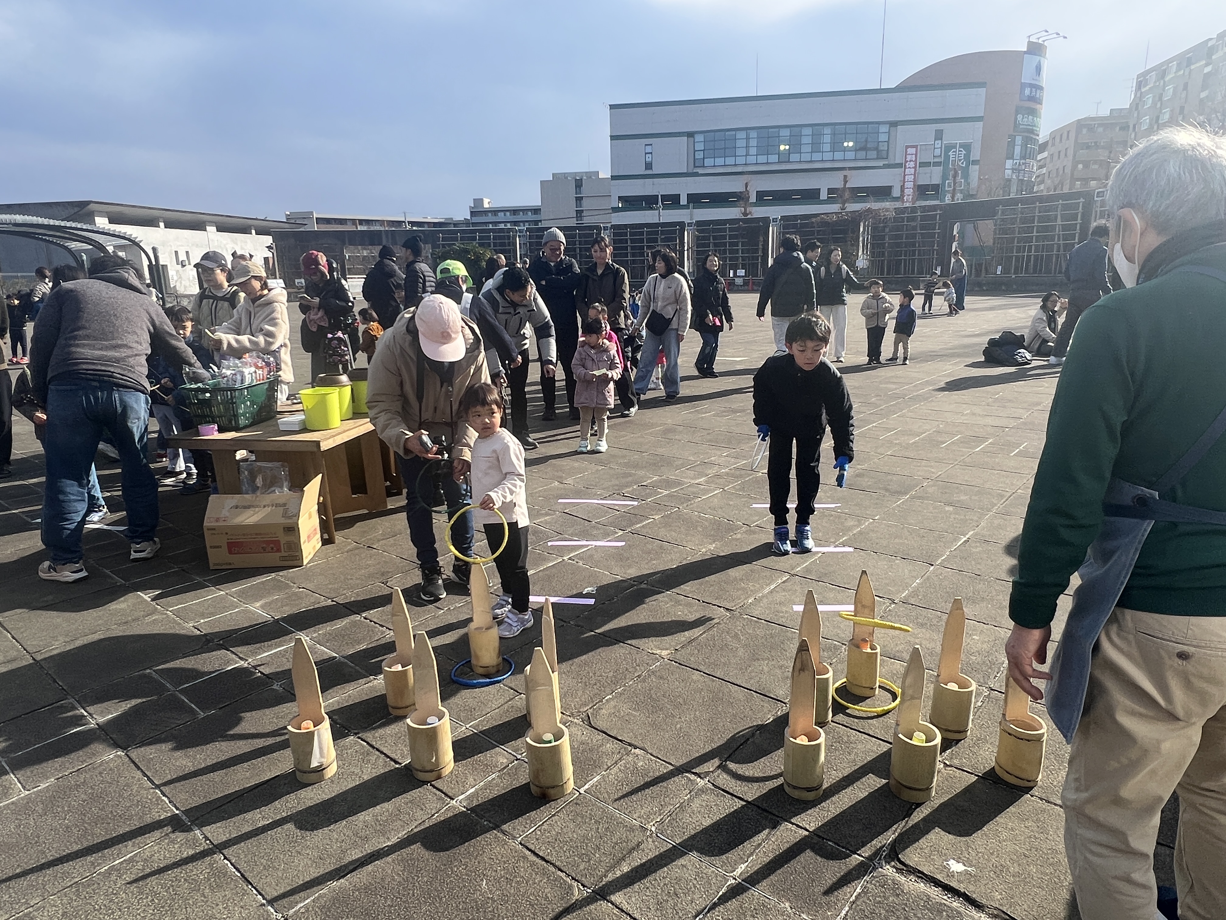 寒風吹く冬の日、昔懐かしい外遊びを楽しみに多くの親子が集まりました。凧上げは不動の人気アイテム、手に取るとすぐに走り出す子供たち。寒さもおかまいなし!の風景があちこちで観られました。
