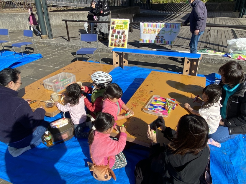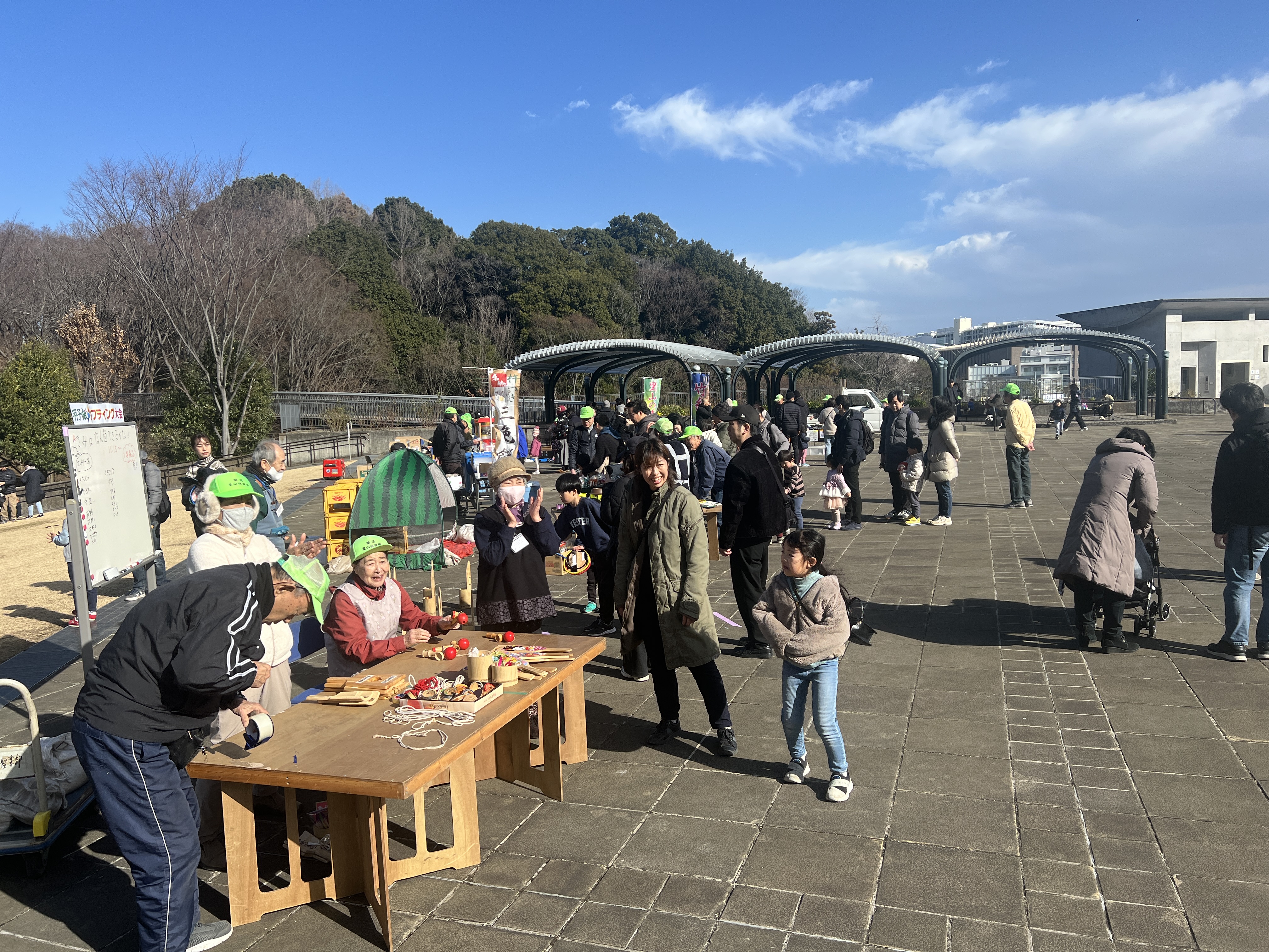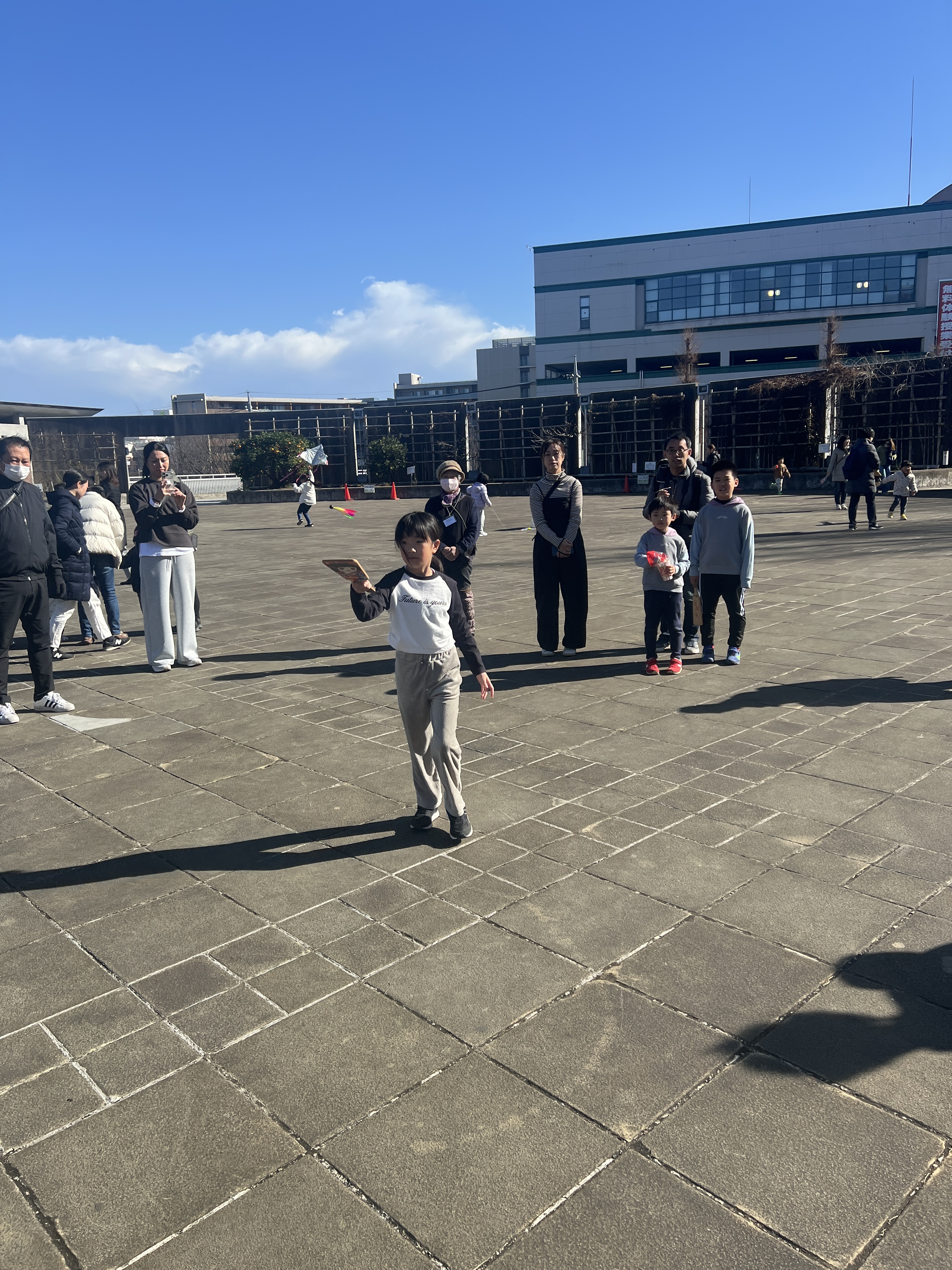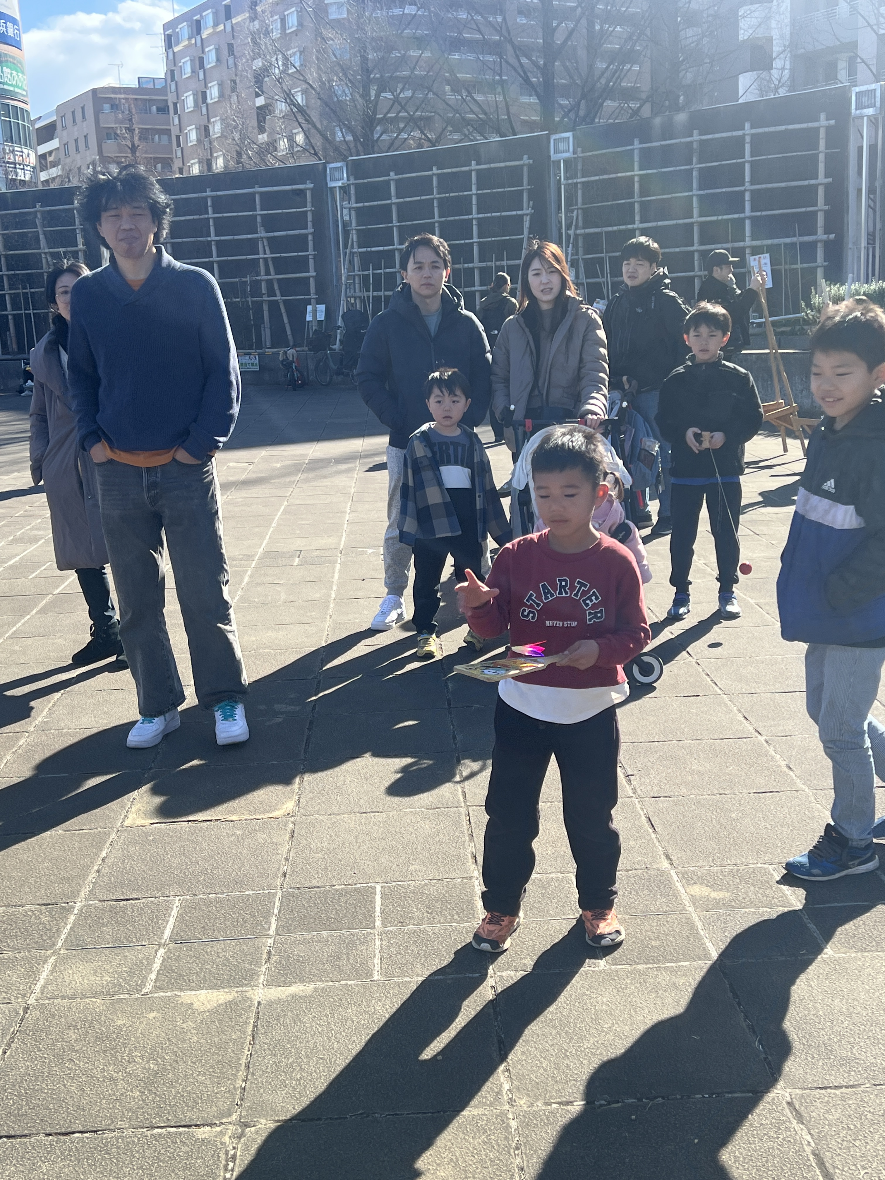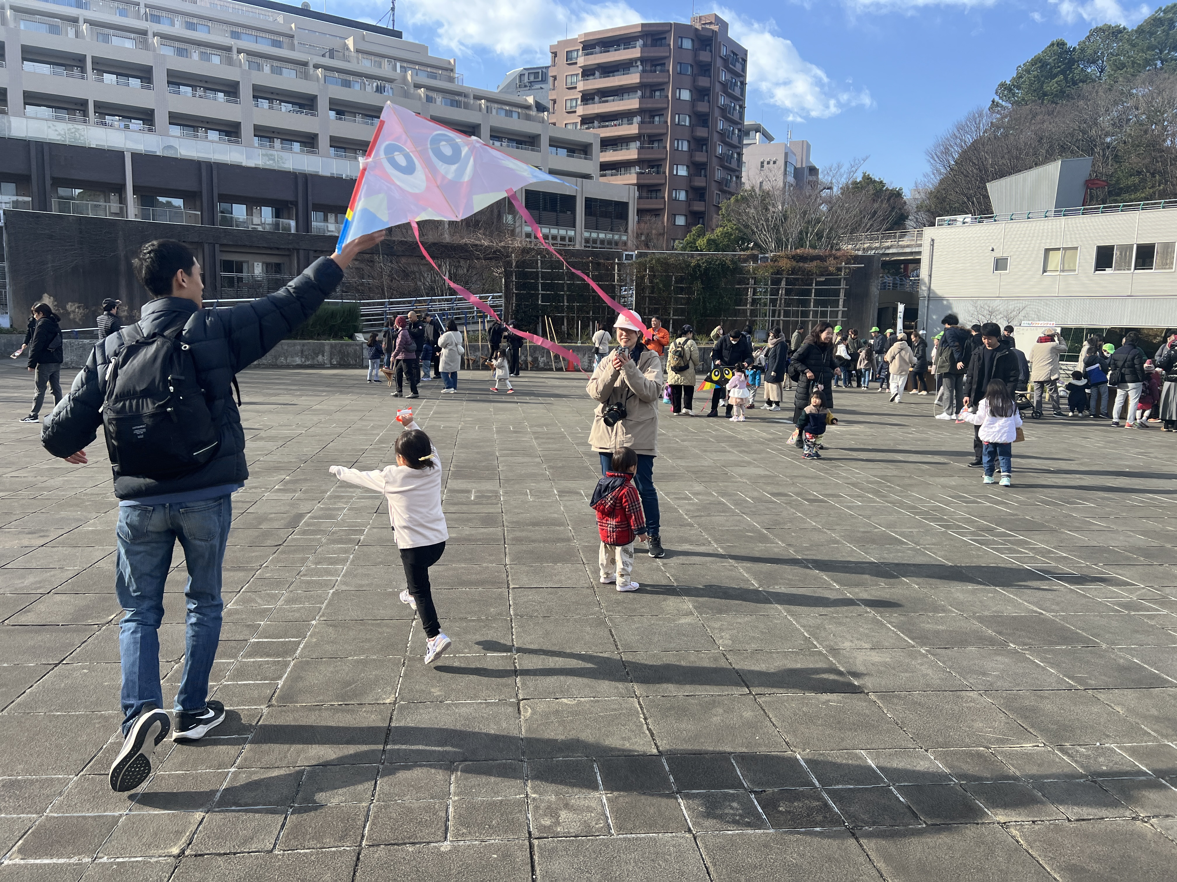 寒風吹く冬の日、昔懐かしい外遊びを楽しみに多くの親子が集まりました。凧上げは不動の人気アイテム、手に取るとすぐに走り出す子供たち。寒さもおかまいなし!の風景があちこちで観られました。