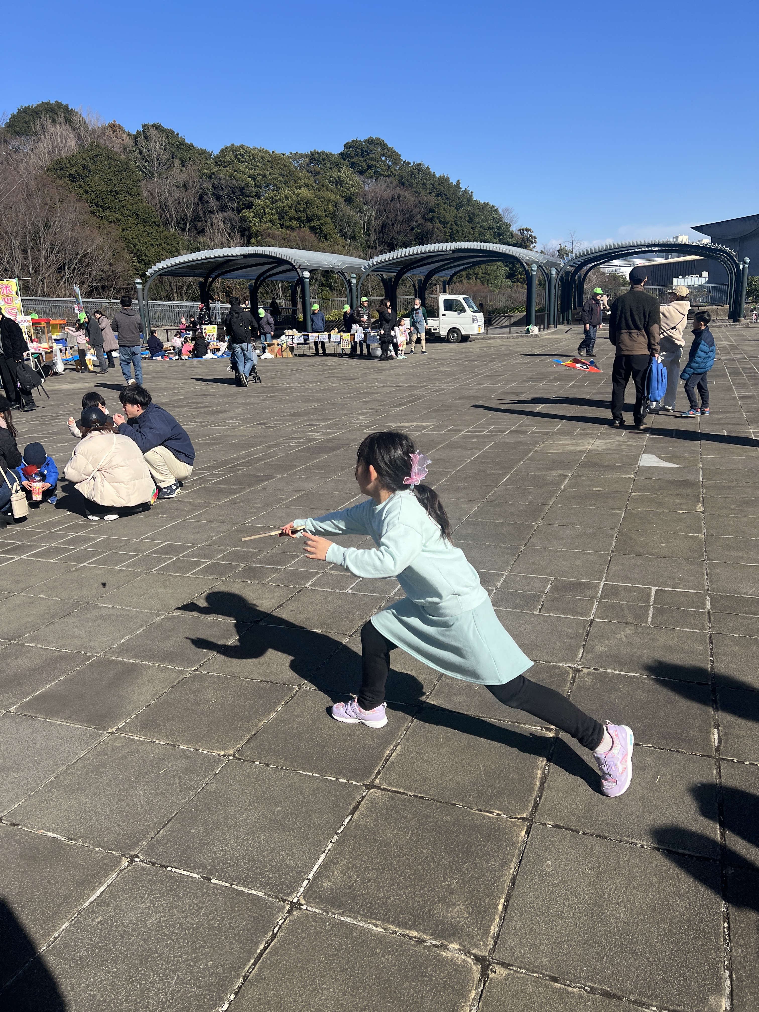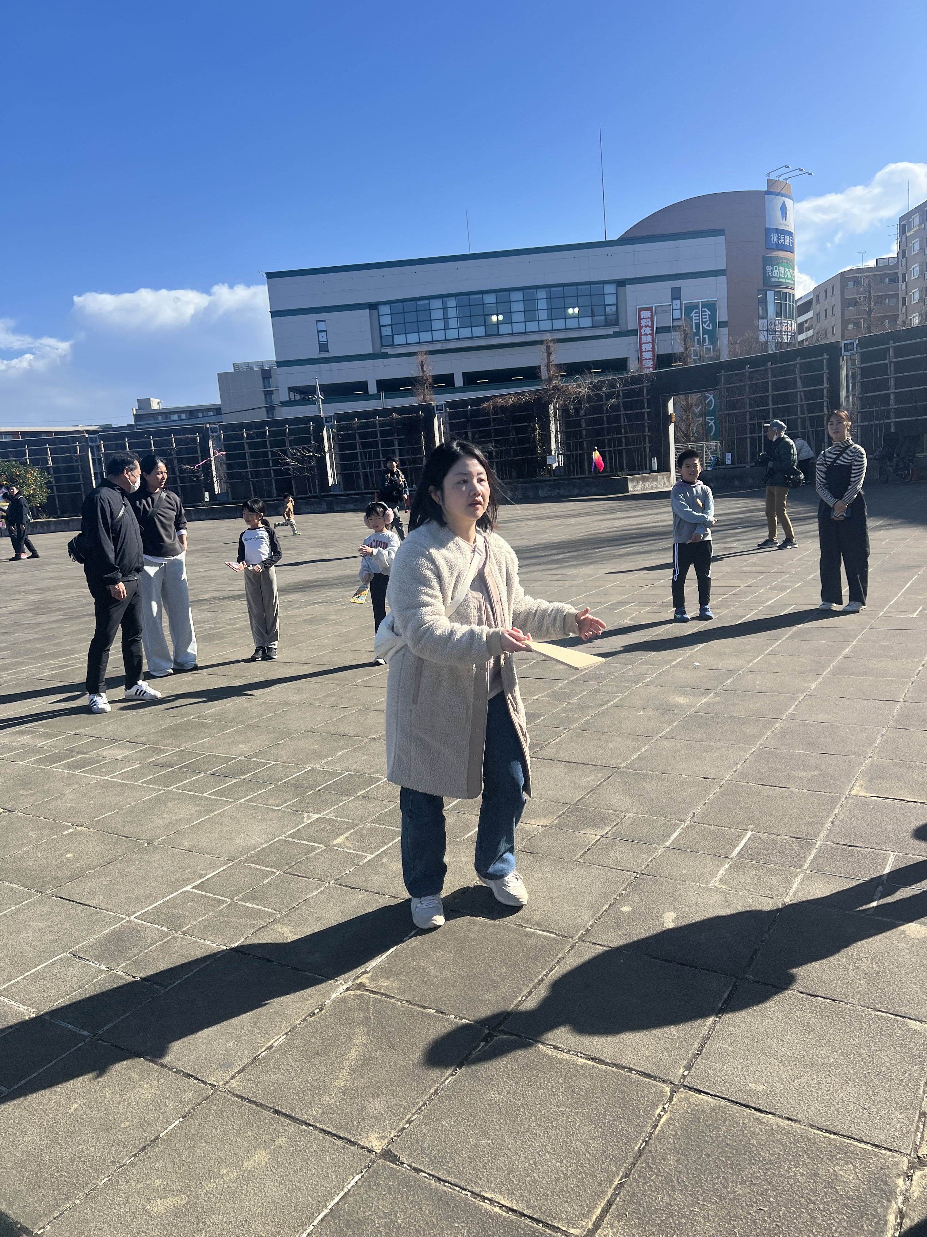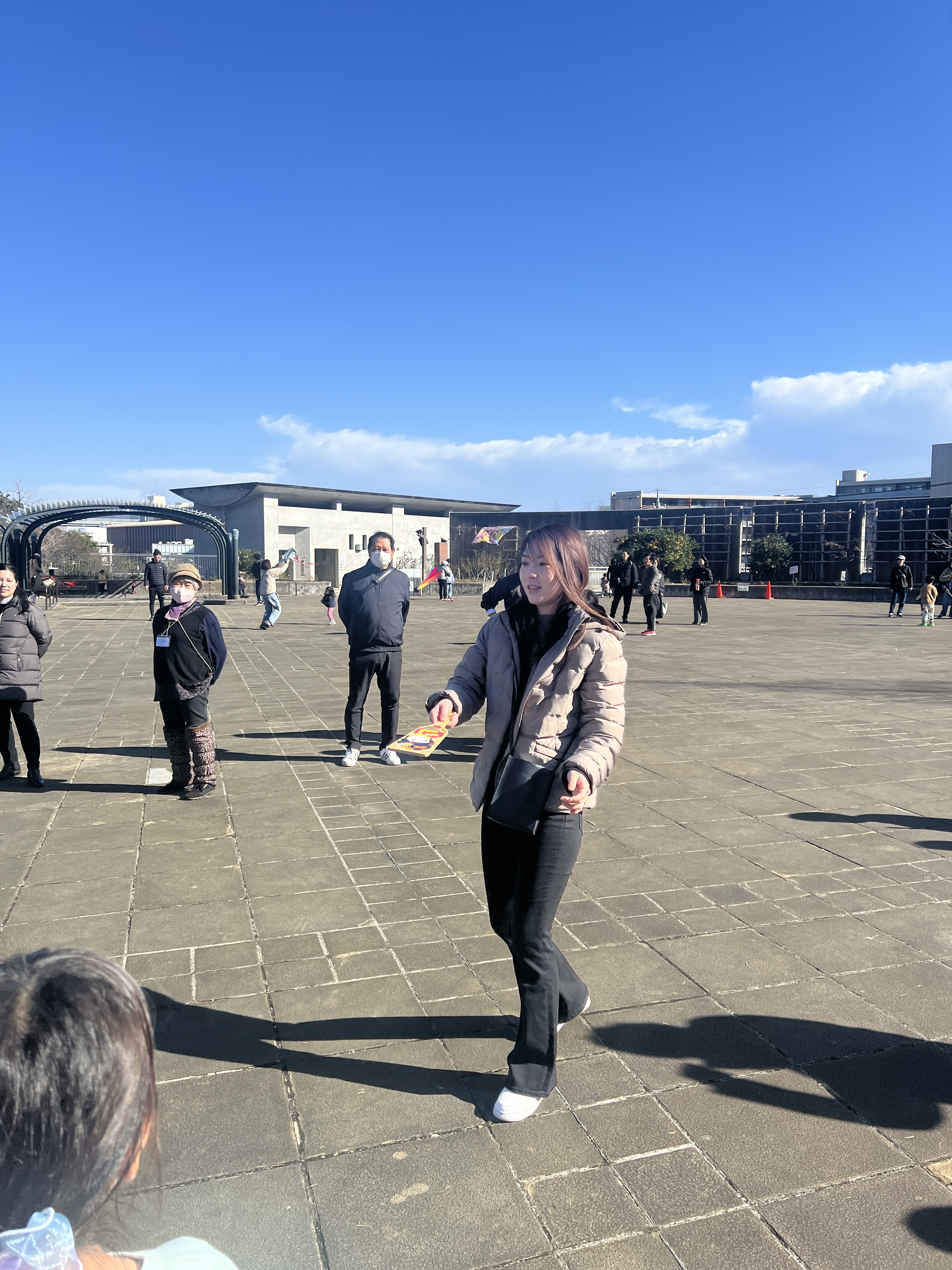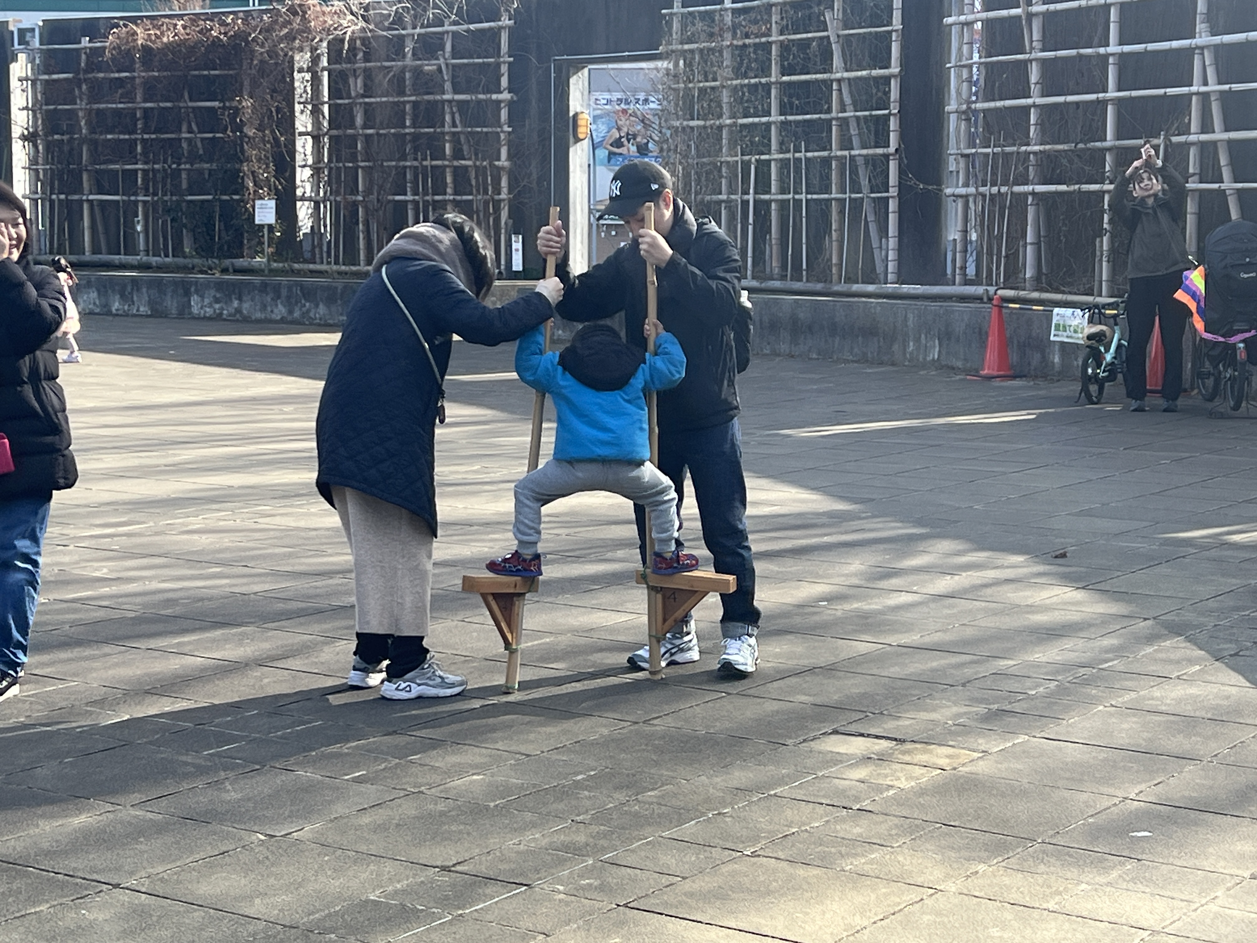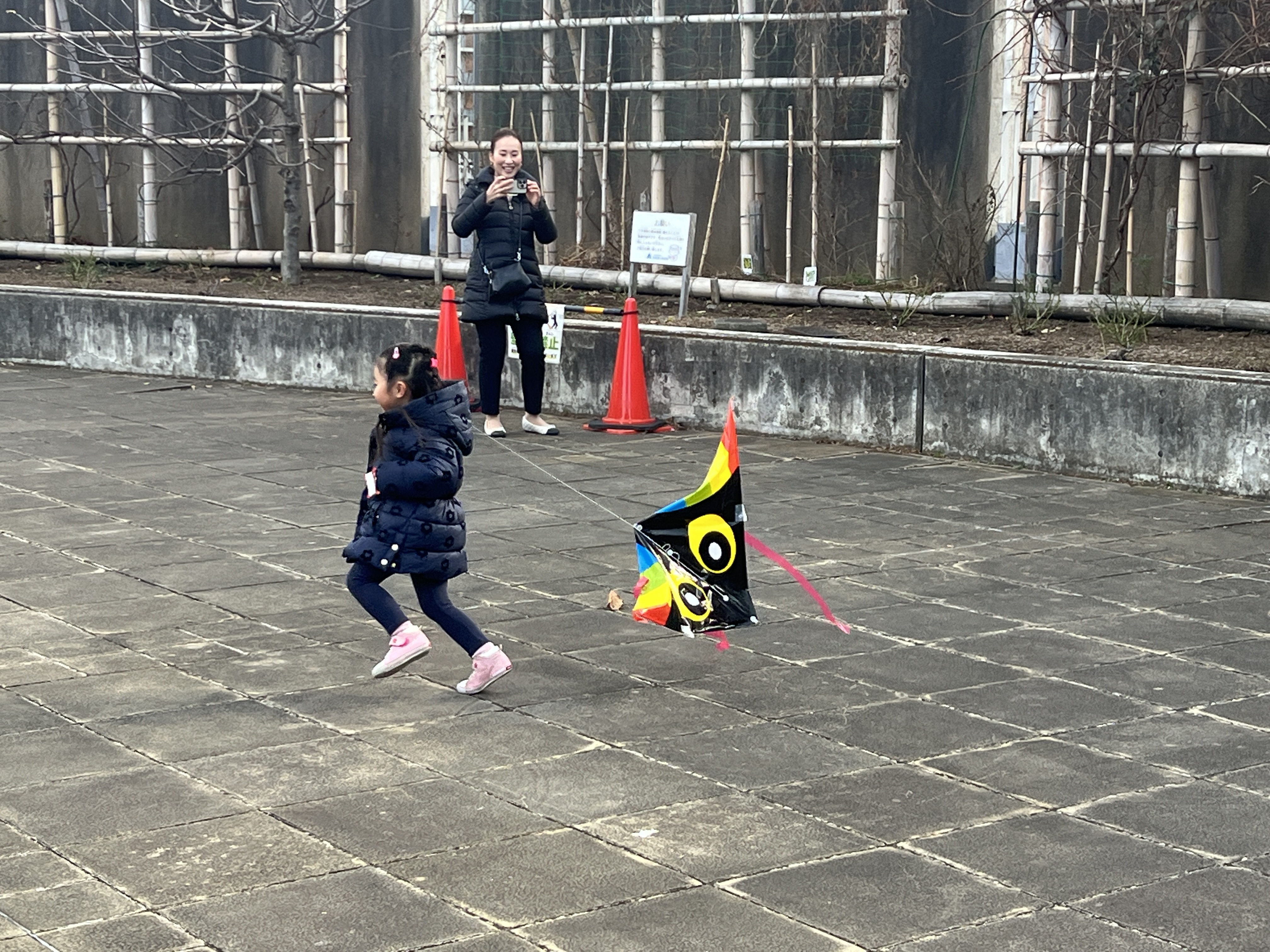 寒風吹く冬の日、昔懐かしい外遊びを楽しみに多くの親子が集まりました。凧上げは不動の人気アイテム、手に取るとすぐに走り出す子供たち。寒さもおかまいなし!の風景があちこちで観られました。