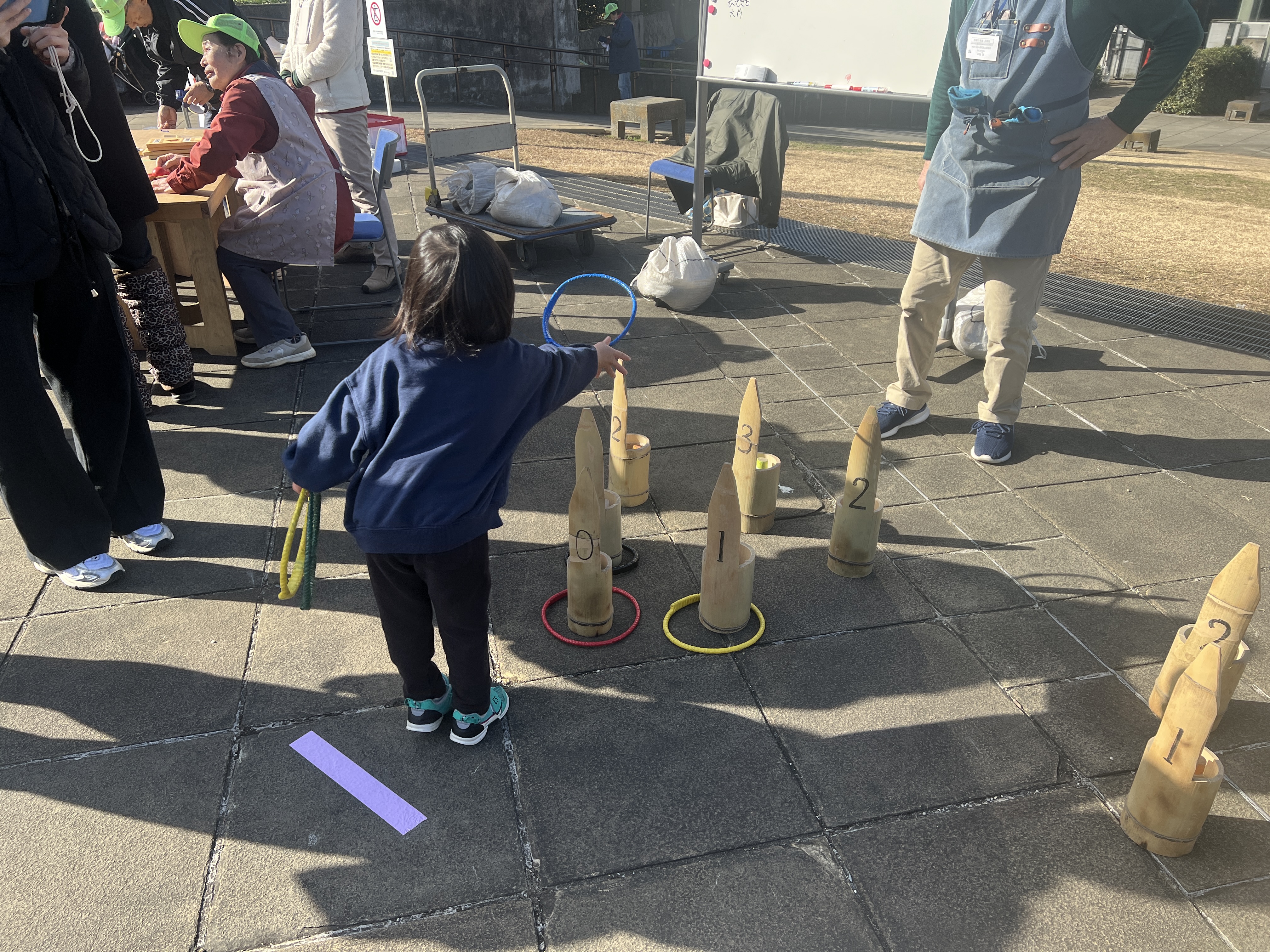 羽根つきは、リフティング大会に備えた練習もしっかり地道にやる親子も多く、本大会が楽しみでした。定番の輪投げは子供だけでなく大人も高得点を狙って真剣に楽しんでいました。独楽回しは紐を巻くところが難しく、我慢して頑張った人がようやく回すステップに。でも、せっかく紐を巻けても上手く回せた人は少ないようです。そして、それ以上に技術が必要だったのは弓。竹製の弓を射って、矢を的に当てるのはとても難しく、何度もチャレンジする人がいました。
