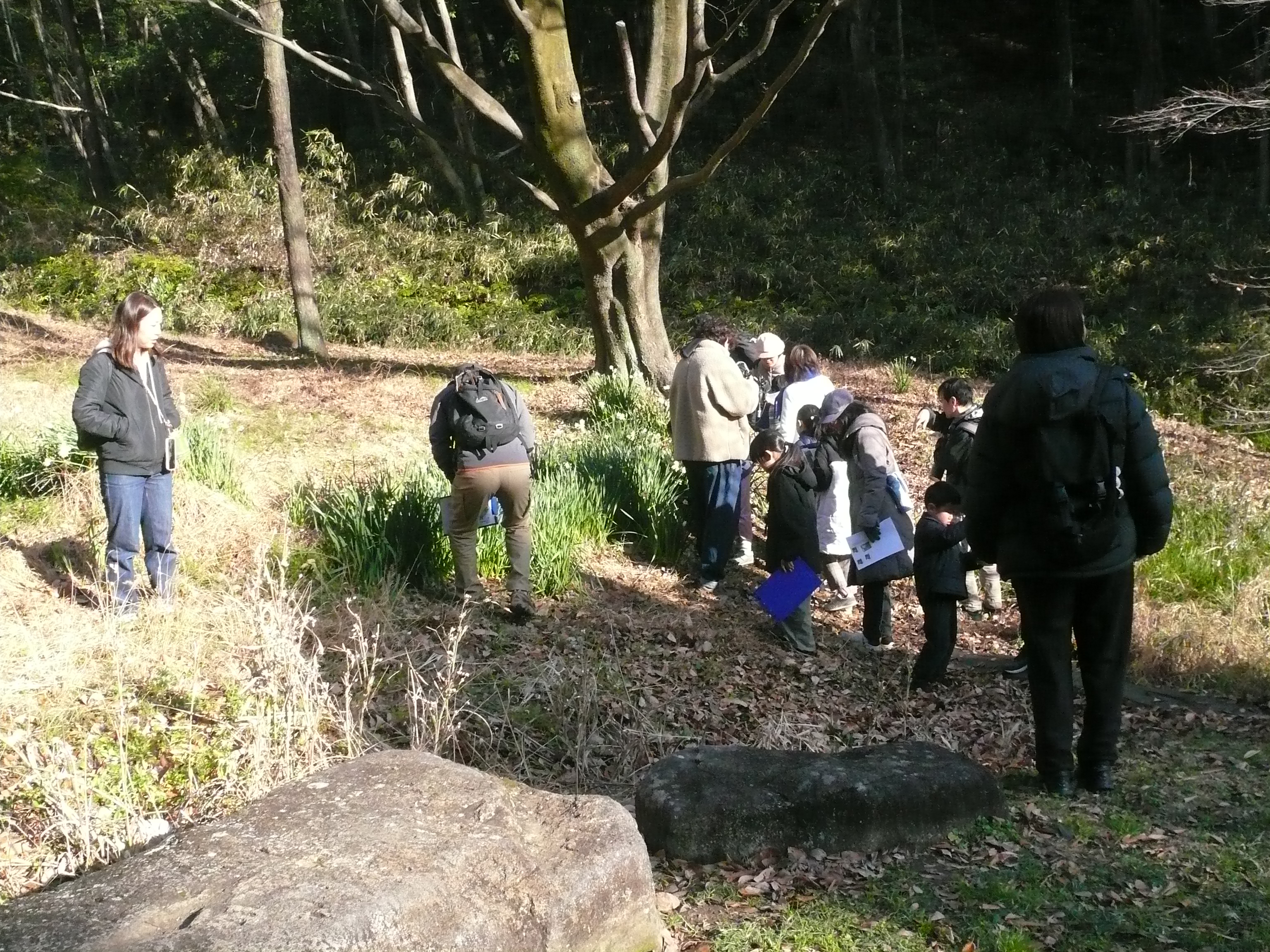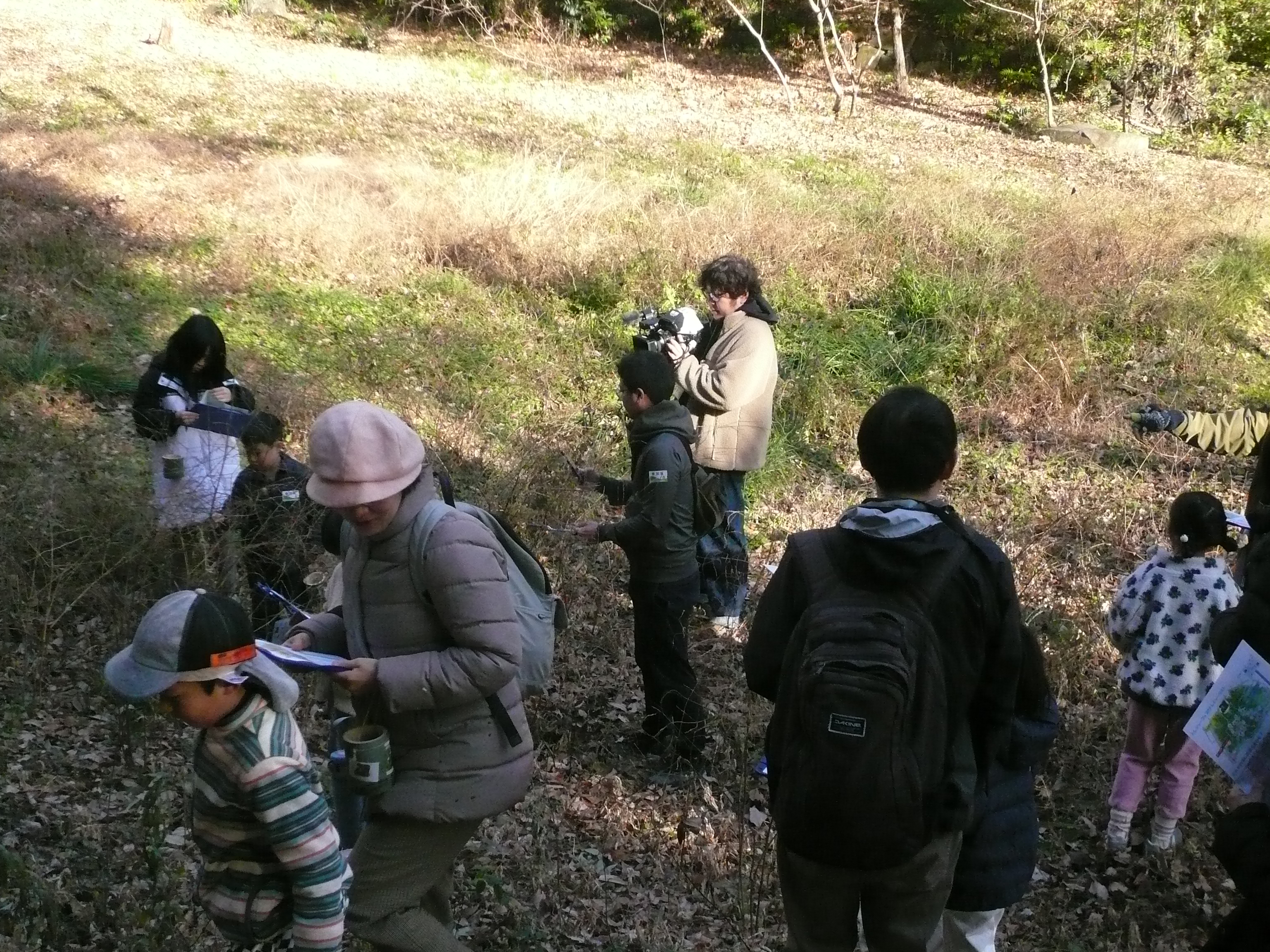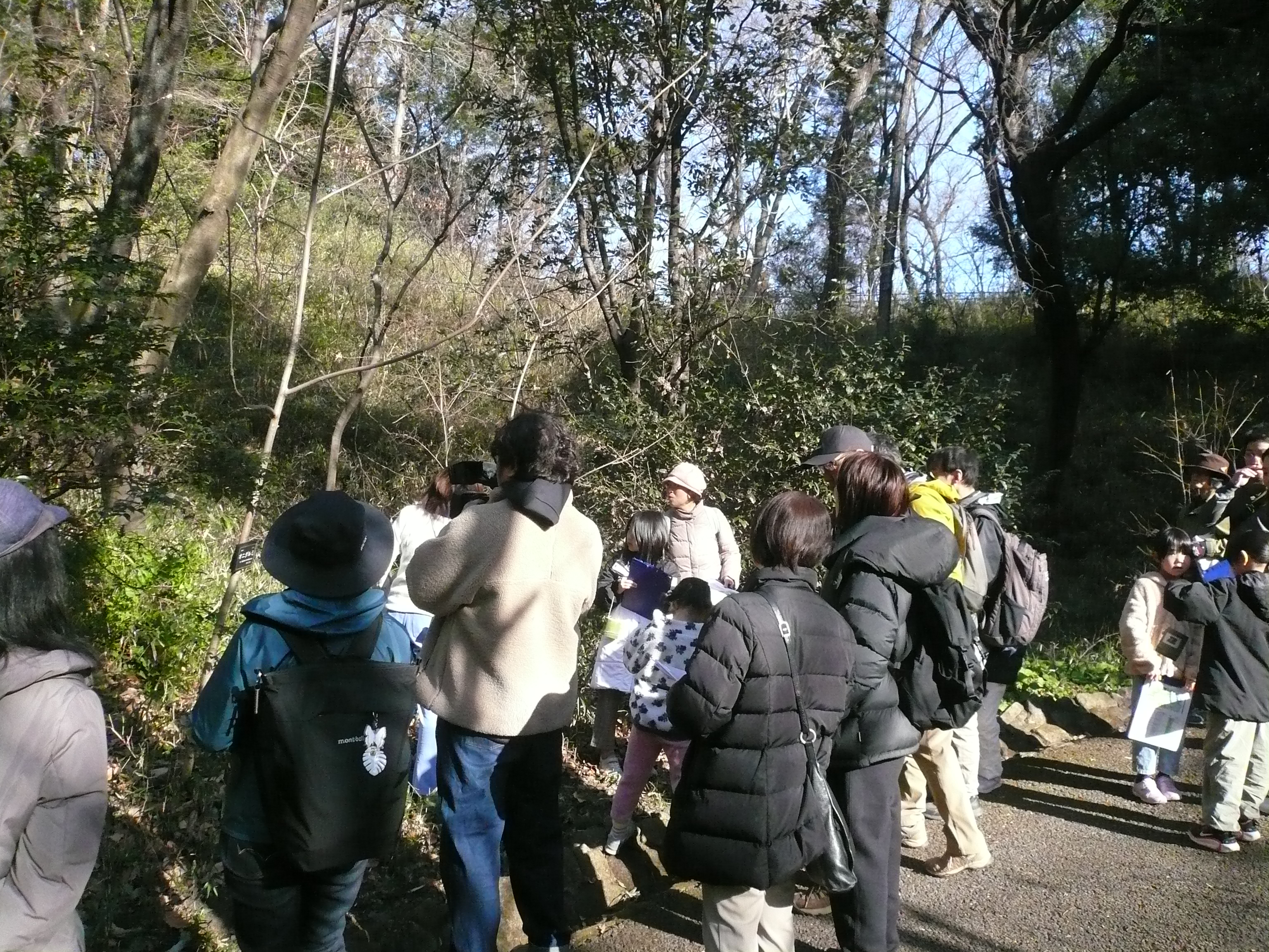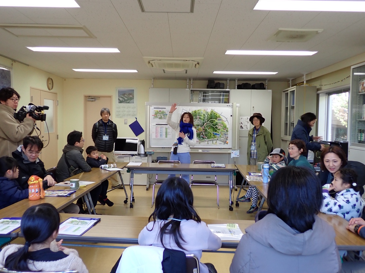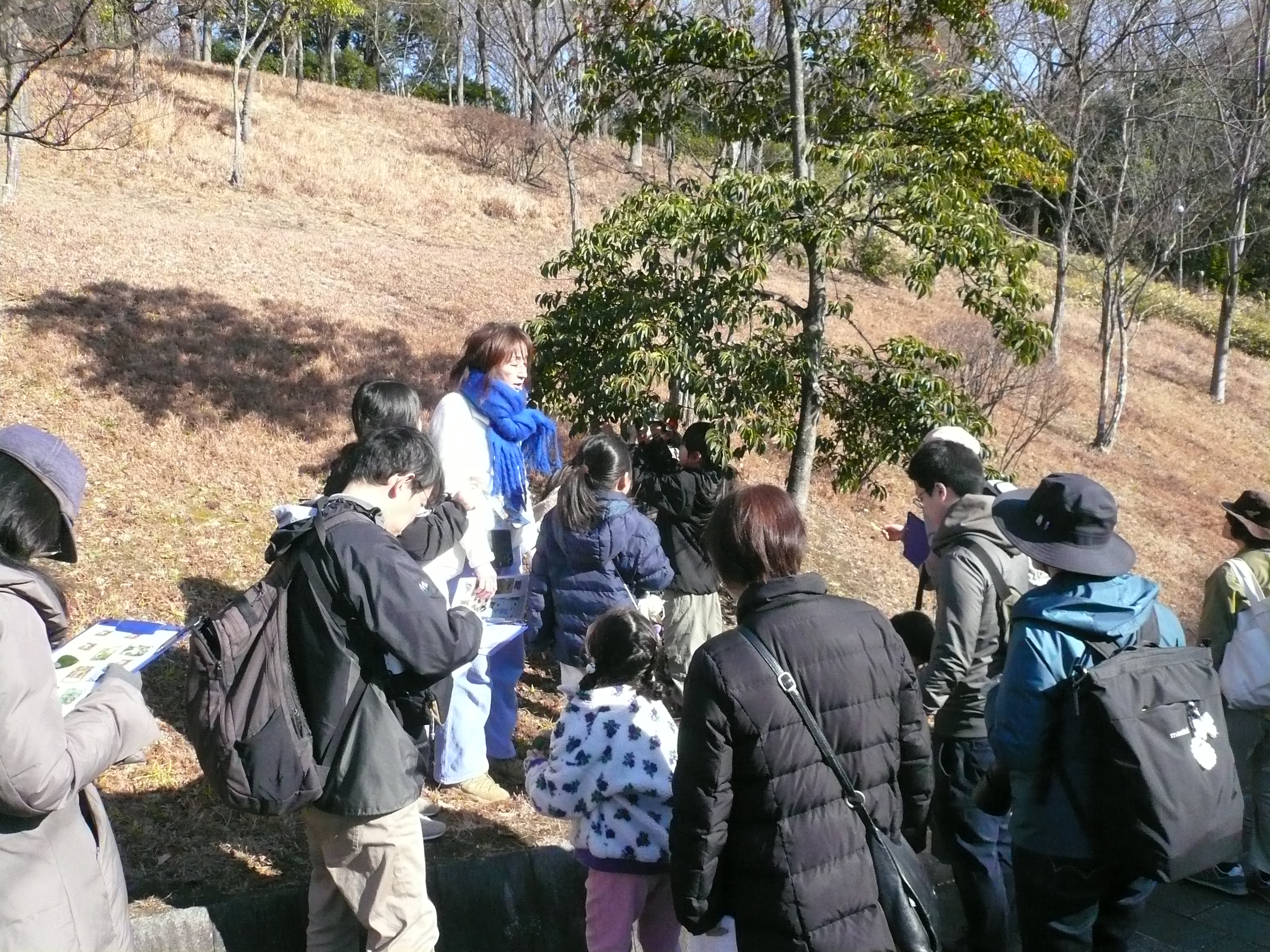 冬晴れの中、6家族14名が参加し、公園内で見られる冬の自然観察を行いました。まず会議室で、今回の観察会の趣旨、方法、ルート等の説明を受けた後、トレジャーマップ、トレジャーリスト、お宝シールを持って、公園に出かけました。