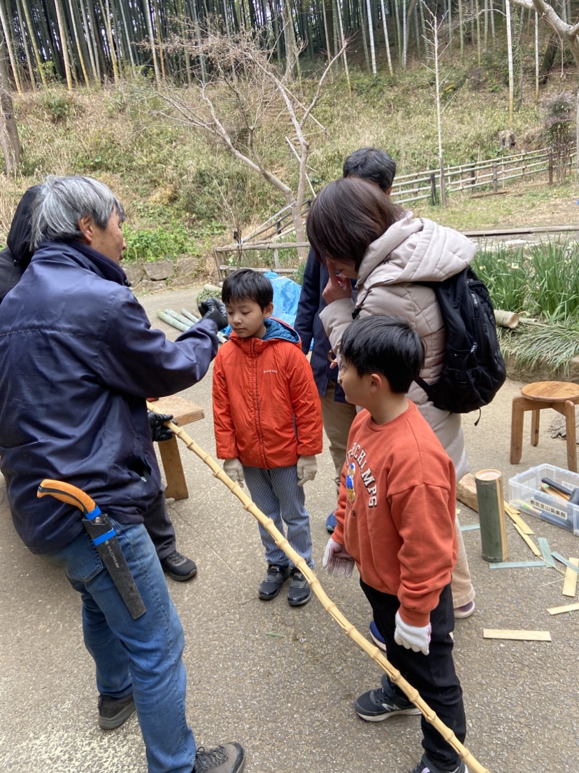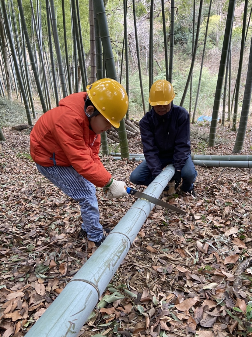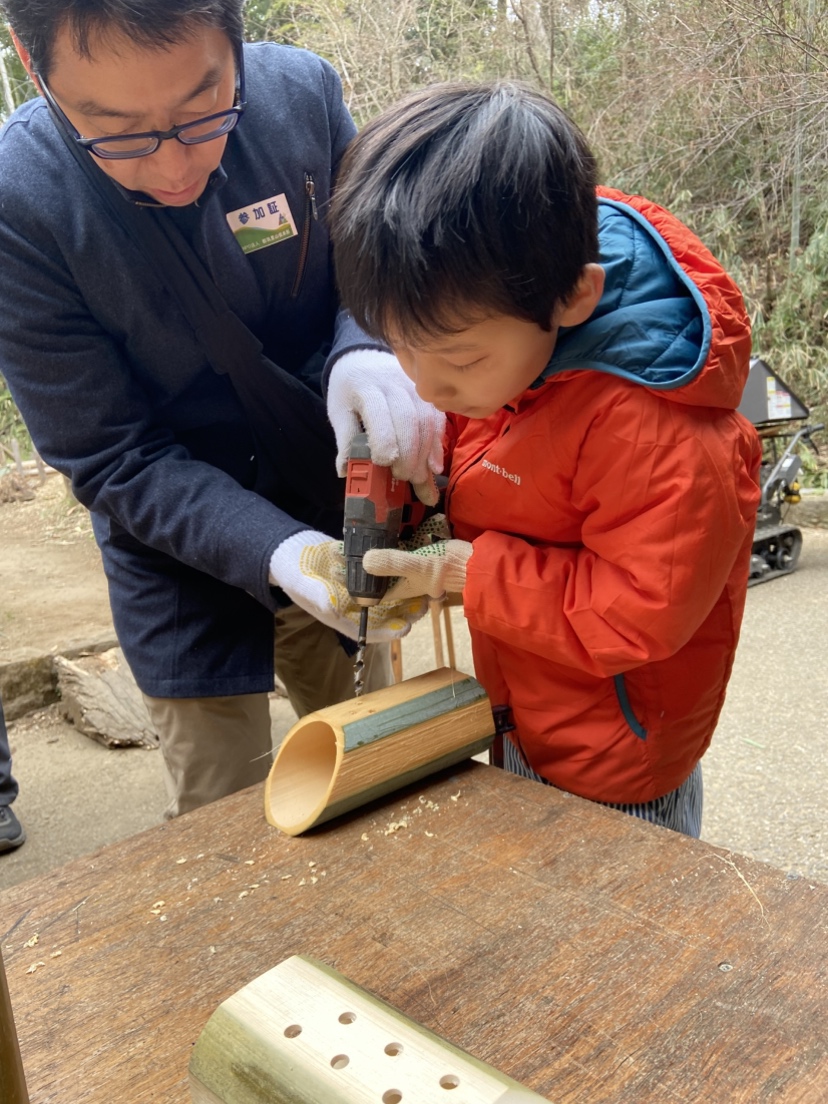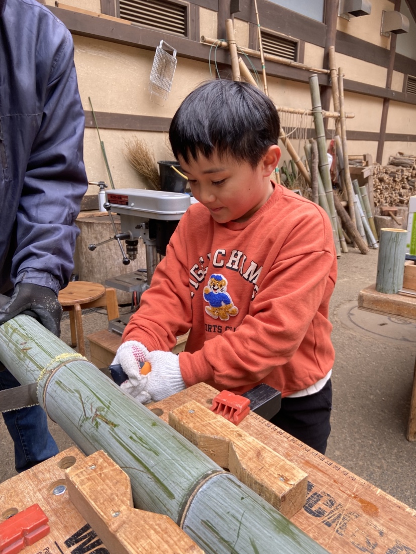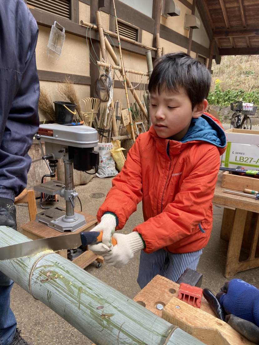 次は竹細工にとりかかろう!のこ引き、穴あけ。普段使ったことない電動工具にトライ!