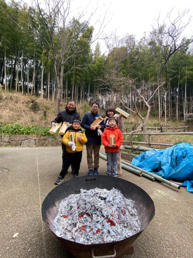 後半の竹細工は、あまりの寒さに無煙炭化器で暖をとりながらの作業となりました。前回同様の竹燈籠(キャンドル)と竹の皿を完成させ、笑顔を写真に収めました。 空からは白いものがちらほら、今晩はつもりそうです。 S.M.