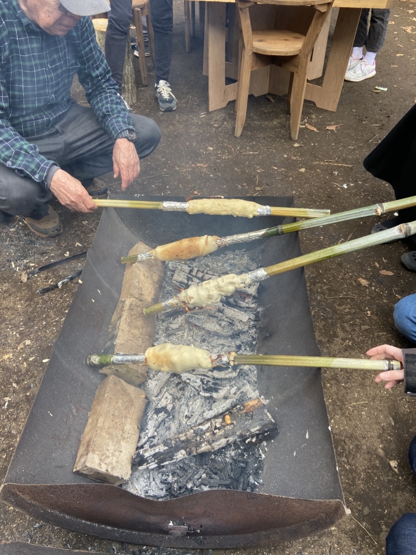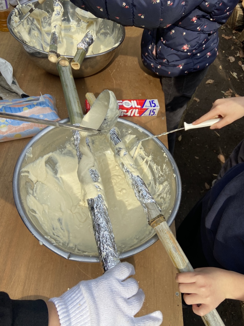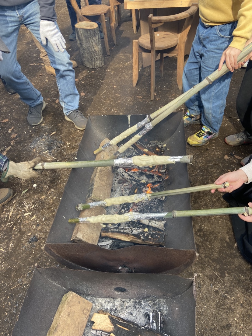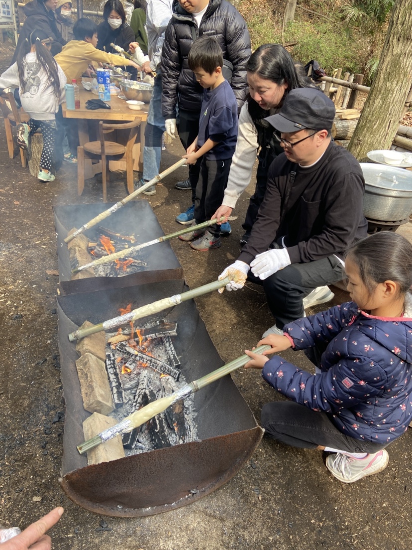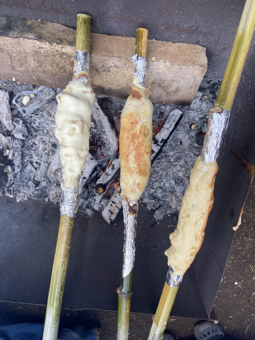 作業がひと段落したのでお昼をみんなで食べました。大勢で賑やかに食べる外飯は楽しく美味しいですね。今回はおまけにバームクーヘンも作ってみました。ホットケーキミックスで生地を作って、竹にアルミホイルを巻いて芯にします。生地を薄く塗って、焚き火の火にかざして焼きます。焼き色がついたら生地を塗って焼きます。これを繰り返して年輪を重ねて太くしたら出来上がりです。根気のいる作業なので何人かの子供は飽きてどこかへ・・・。でも、出来上がったバームクーヘンは美味しく頂きました。