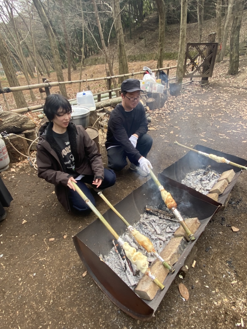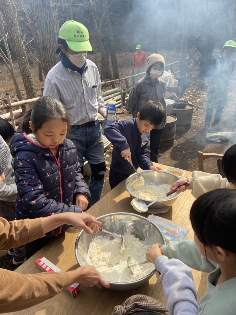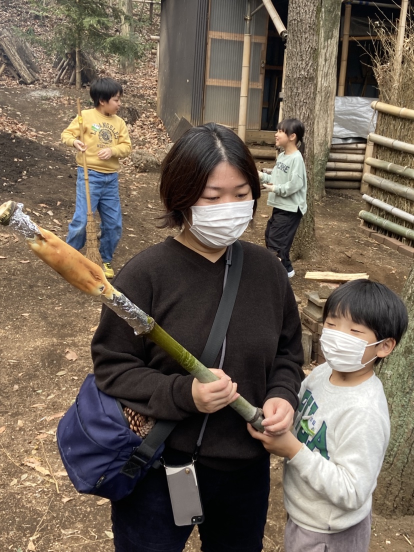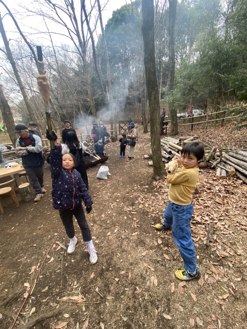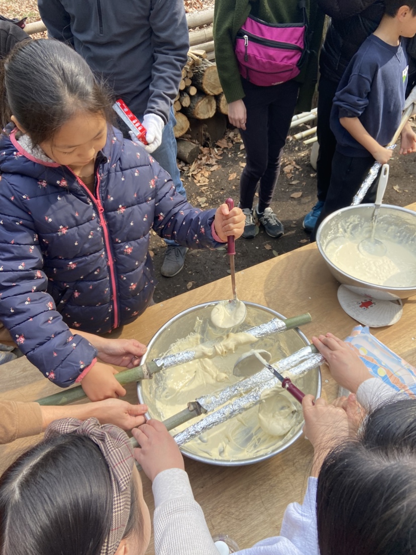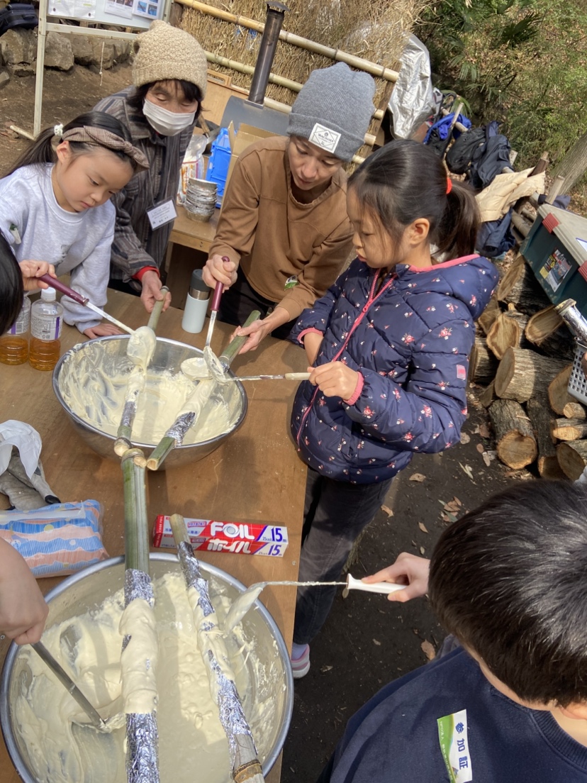 作業がひと段落したのでお昼をみんなで食べました。大勢で賑やかに食べる外飯は楽しく美味しいですね。今回はおまけにバームクーヘンも作ってみました。ホットケーキミックスで生地を作って、竹にアルミホイルを巻いて芯にします。生地を薄く塗って、焚き火の火にかざして焼きます。焼き色がついたら生地を塗って焼きます。これを繰り返して年輪を重ねて太くしたら出来上がりです。根気のいる作業なので何人かの子供は飽きてどこかへ・・・。でも、出来上がったバームクーヘンは美味しく頂きました。