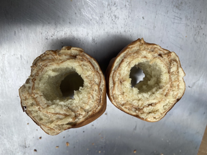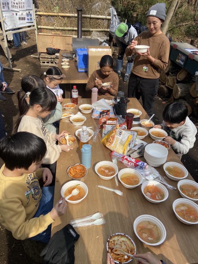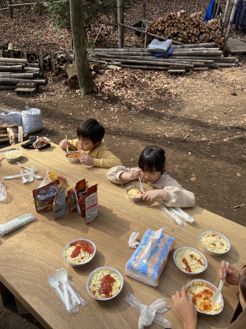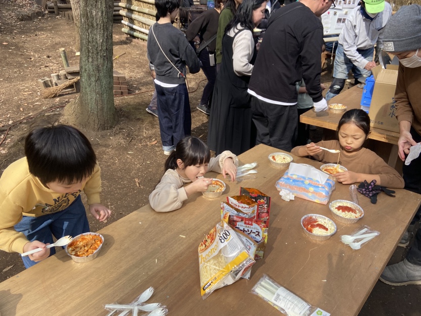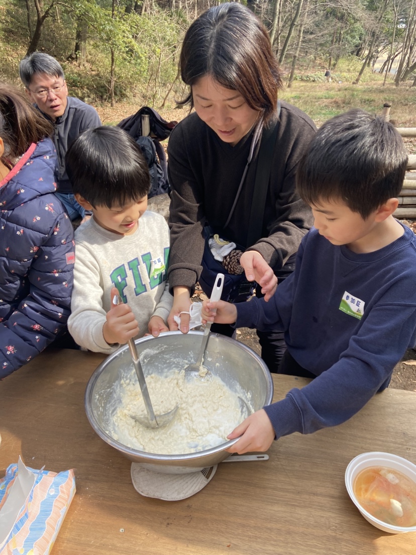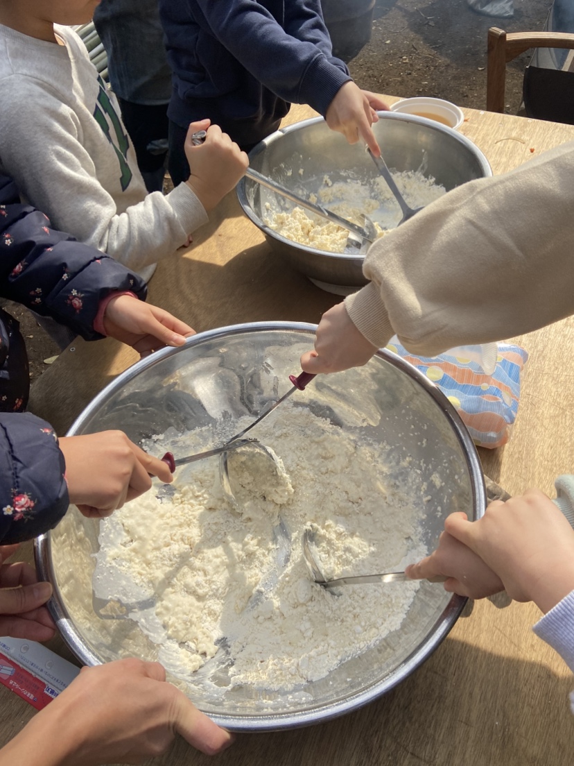 作業がひと段落したのでお昼をみんなで食べました。大勢で賑やかに食べる外飯は楽しく美味しいですね。今回はおまけにバームクーヘンも作ってみました。ホットケーキミックスで生地を作って、竹にアルミホイルを巻いて芯にします。生地を薄く塗って、焚き火の火にかざして焼きます。焼き色がついたら生地を塗って焼きます。これを繰り返して年輪を重ねて太くしたら出来上がりです。根気のいる作業なので何人かの子供は飽きてどこかへ・・・。でも、出来上がったバームクーヘンは美味しく頂きました。
