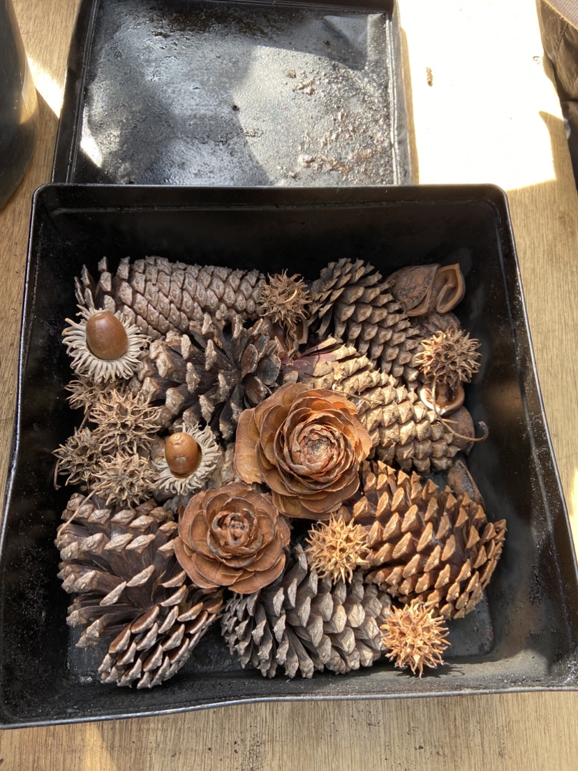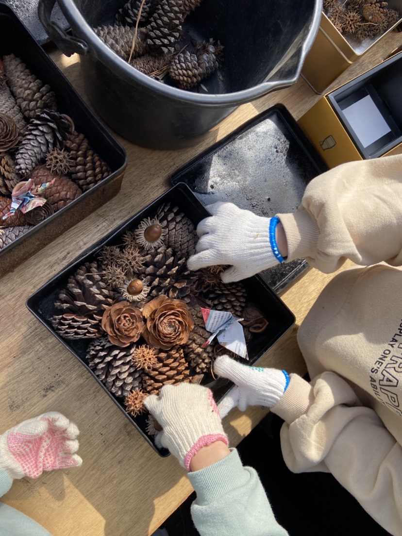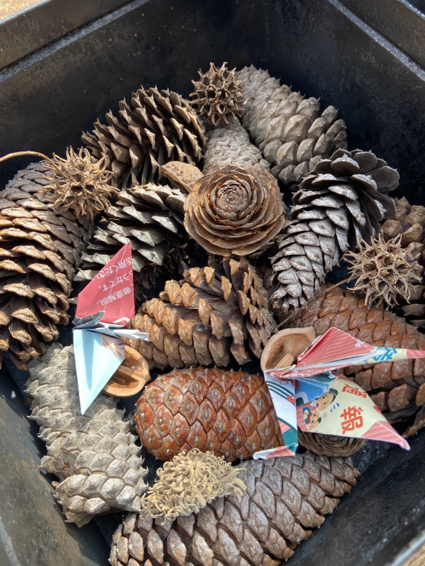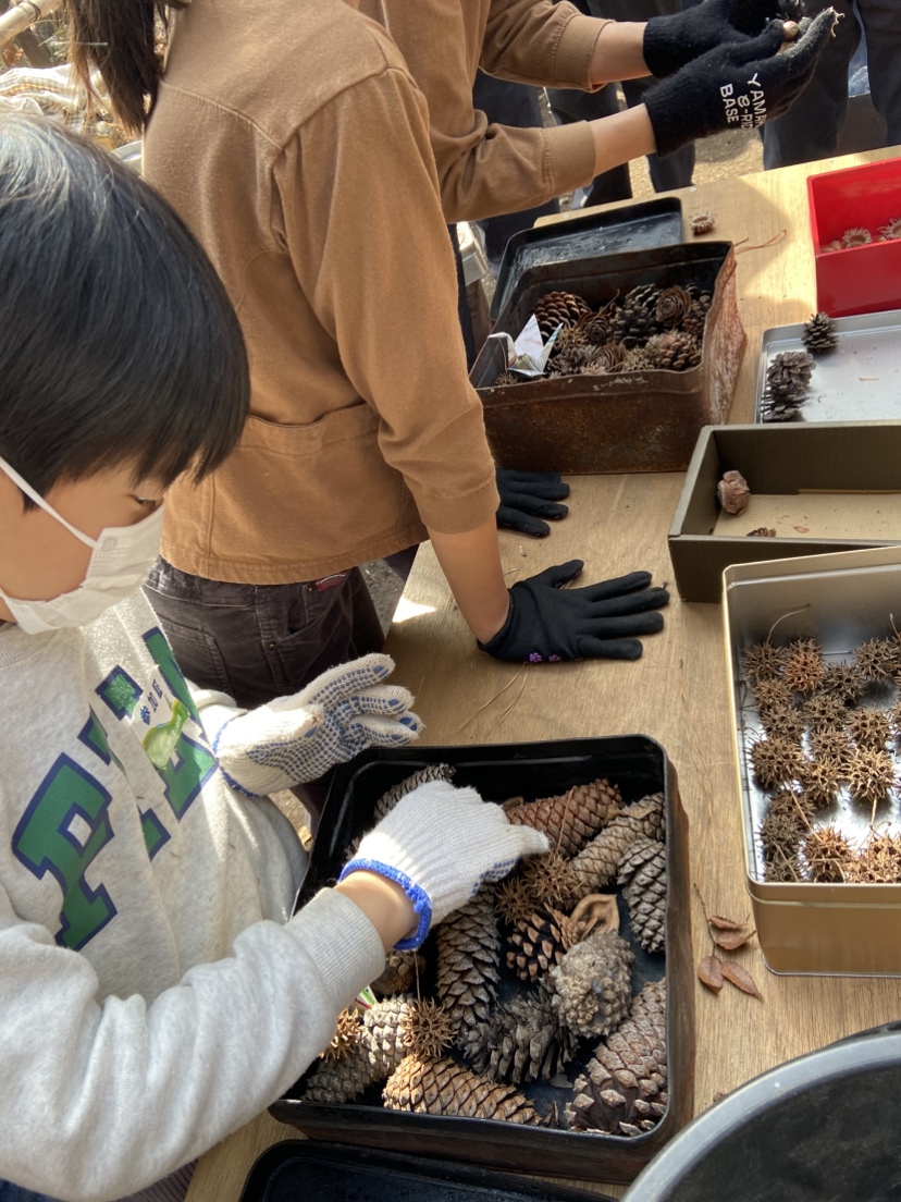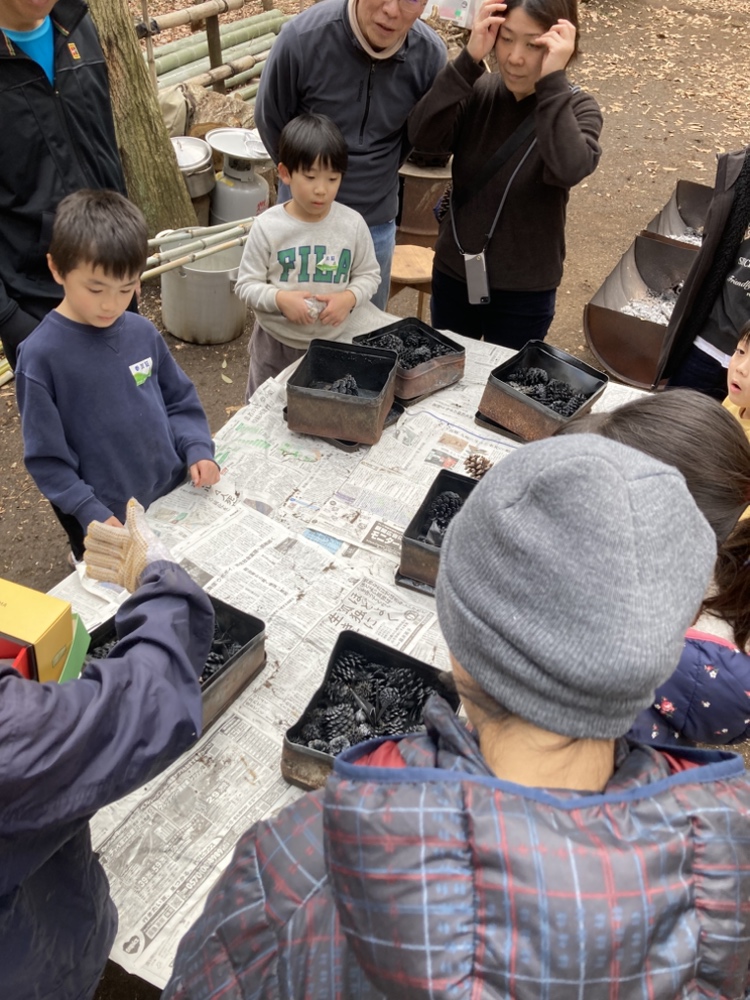 華炭作りでは丁寧な説明のもと出来上がりをイメージして、華炭の素となる松ぼっくりや鬼胡桃の殻、モミジバフウの実などを缶にグループごとに詰めました。缶は針金で縛って蓋を固定して、半裁ドラムの火の中に投入します。しばらして中から煙が立ち上って、煙が出てこなくなったら、缶をとりだして、みんなで掘った穴に埋めて、熱を下げると当時に発火を防止します。