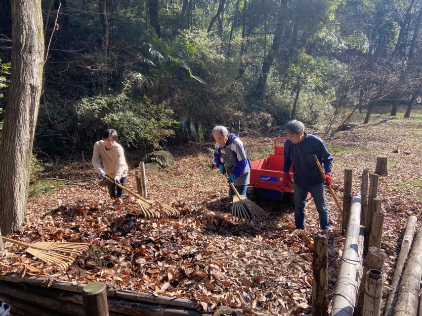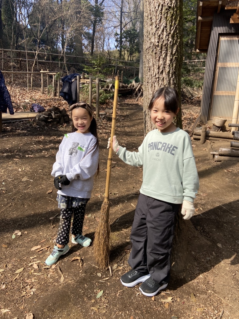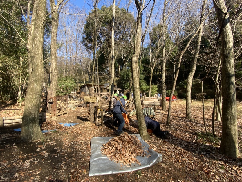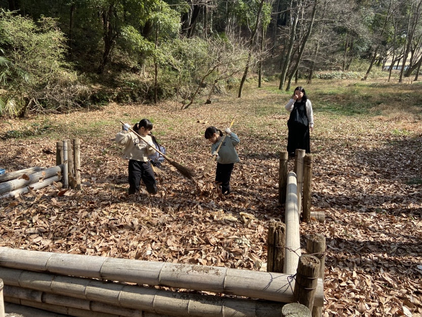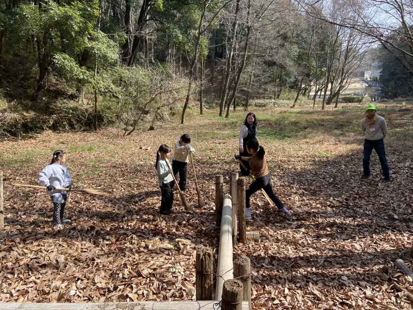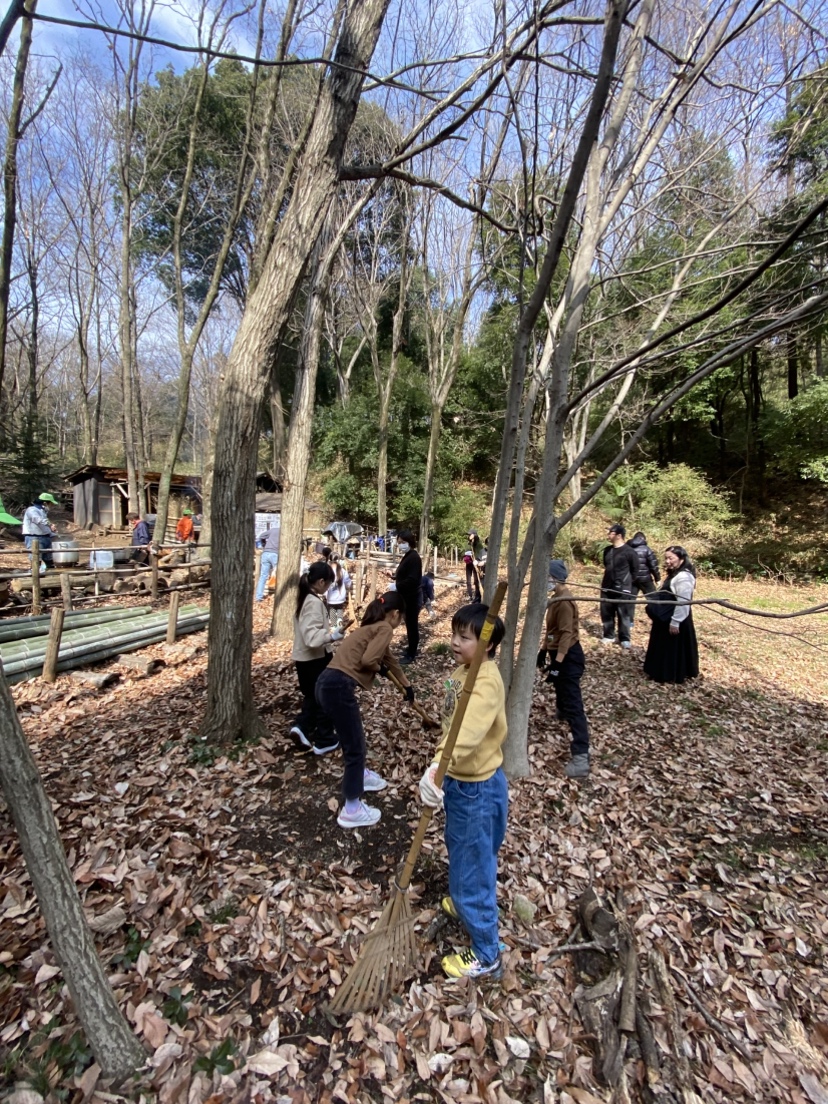 神聖なる火起こしの前に、周りの落ち葉を掻いて、入念にお掃除!