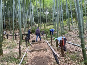 竹林の整備と併行して、保全作業は自然体験施設として、区画されたエリアで、雑木林の間伐・下草刈・竹垣作り・実生の苗木の移植・草木の育成などを行っています。活動を通して、ノコギリやナタ・カマなどの道具の使い方を習得することが出来ます。