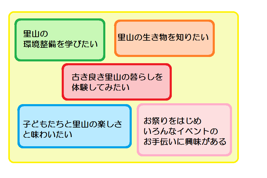 私達は、昔ながらの里山の景観と営みを守りつつ、自然から学び、時には試行錯誤し、たくさんのボランティアで力を合わせ、次世代につなげるお手伝いをしています。そして何より楽しんで活動しています。そんな里山倶楽部にあなたも参加しませんか?